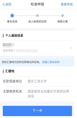 第三步:确认“个人基础信息”“任职受雇单位”,确认无误点击“下一步”。