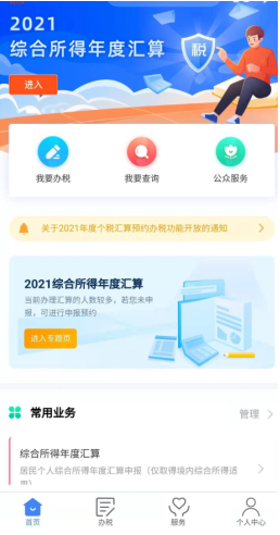 第一步:下载安装“个人所得税”手机客户端,打开后点击右下方“个人中心”,然后点击上方登录、注册,使用证件号或手机号登陆,(如忘记密码,需找回密码后再登录)。然后点击“办税”,后点击综合所得年度汇算。