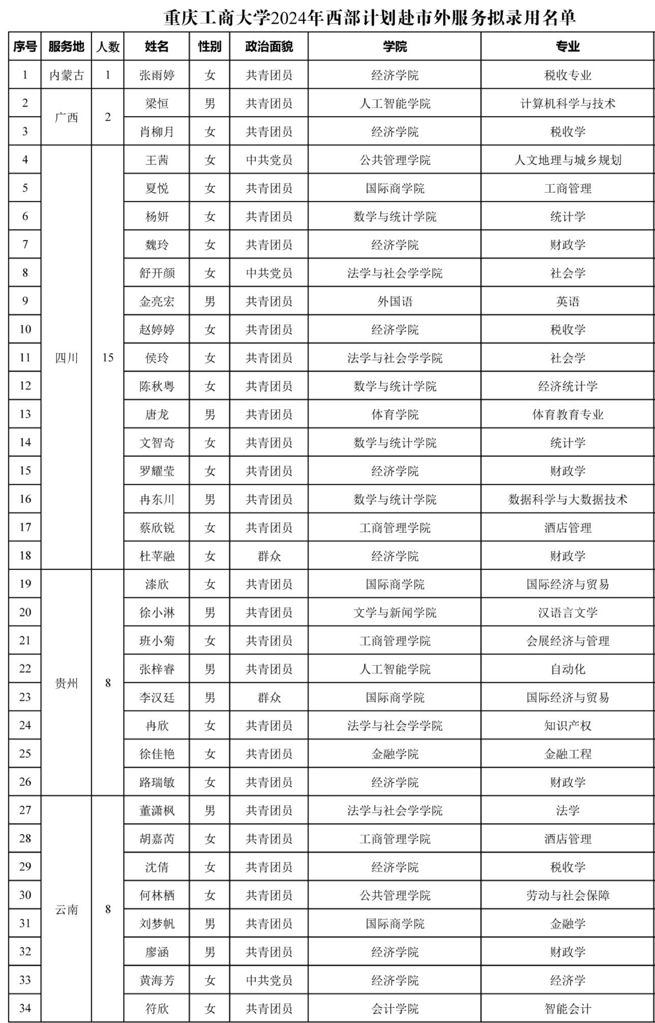 按照团市委、重庆市西部计划项目办的统一部署和安排,6月3日校团委、组织部、学生处、研究生院、招生就业处联合举行了2024年西部计划赴市外服务选拔面试考核,对报名参与内蒙古、广西、四川、贵州、云南、西藏、陕西、新疆、新疆生产建设兵团、吉林、湖北西部计划服务的134名学生进行了面试考核。结合在校期间综合表现、面试考核情况,按市项目办划拨的名额,拟录取学生72名,现将名单公示如下: