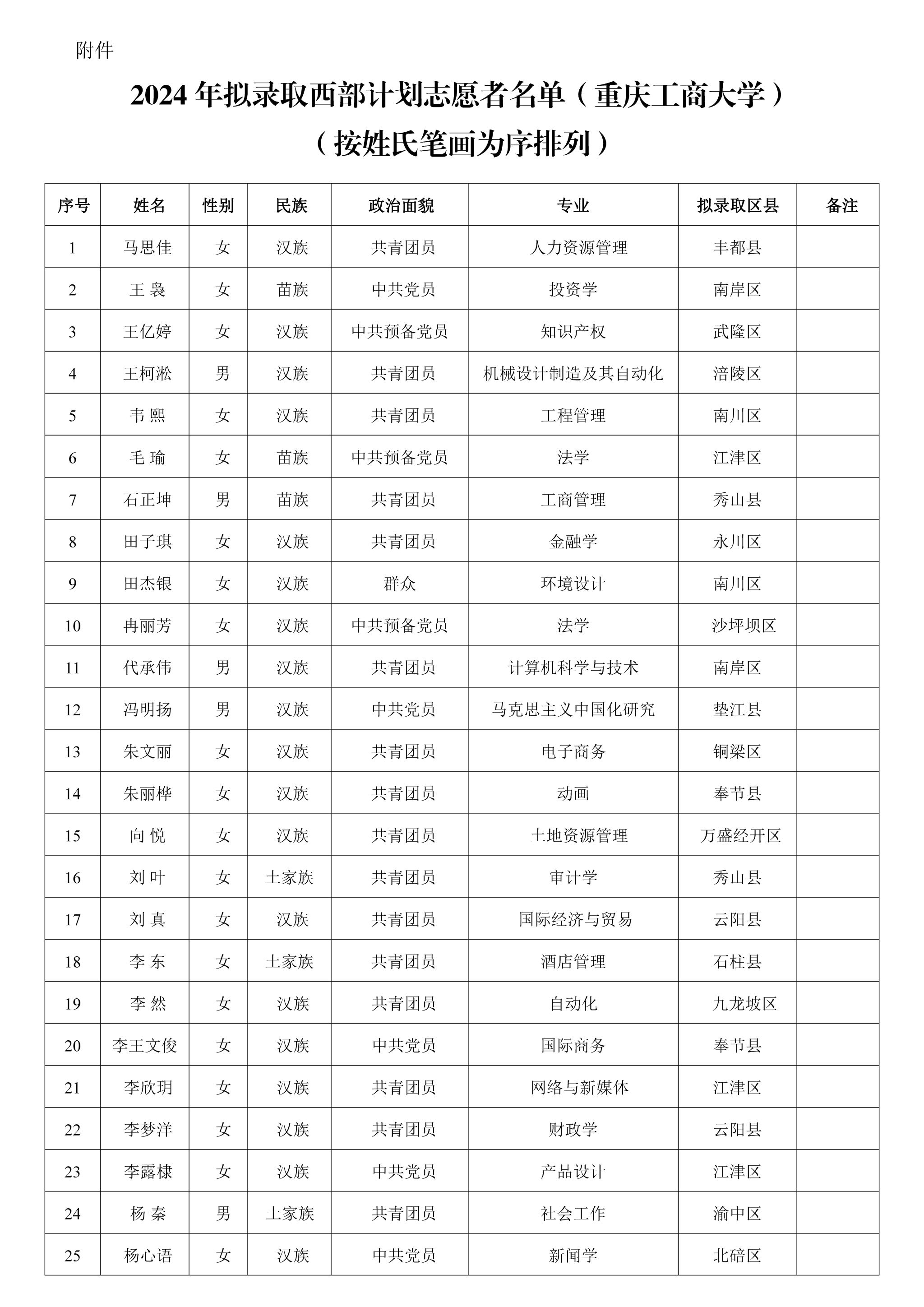 按照重庆市西部计划项目办的统一部署和安排,经学生本人报名、各学院推荐、校团委审核、重庆市各区县项目办招募考核等环节,根据6月5日市项目办反馈情况,现将我校2024年赴市内参与西部计划服务拟录取名单公示如下:(共52名,按姓氏笔画为序排列)