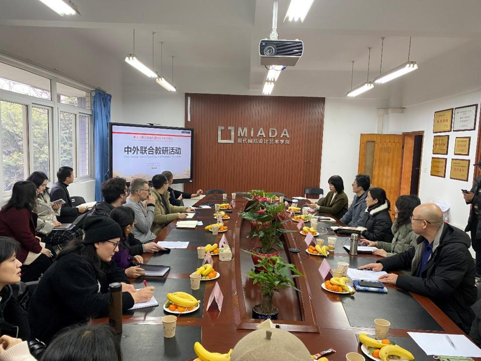 1月7日下午,副校长柏群到现代国际设计艺术学院调研指导中外教师线上线下联合教研活动。教学质量监督与评估办公室主任曾晓松、教务处副处长宋瑛、现代国际设计艺术学院党总支书记李莉莎、院长陈绪春、系部主任、教务负责人以及全体中方专职教师和在渝外籍教师现场参加了活动,五位欧洲外籍教师线上参与。教研活动由陈绪春主持。