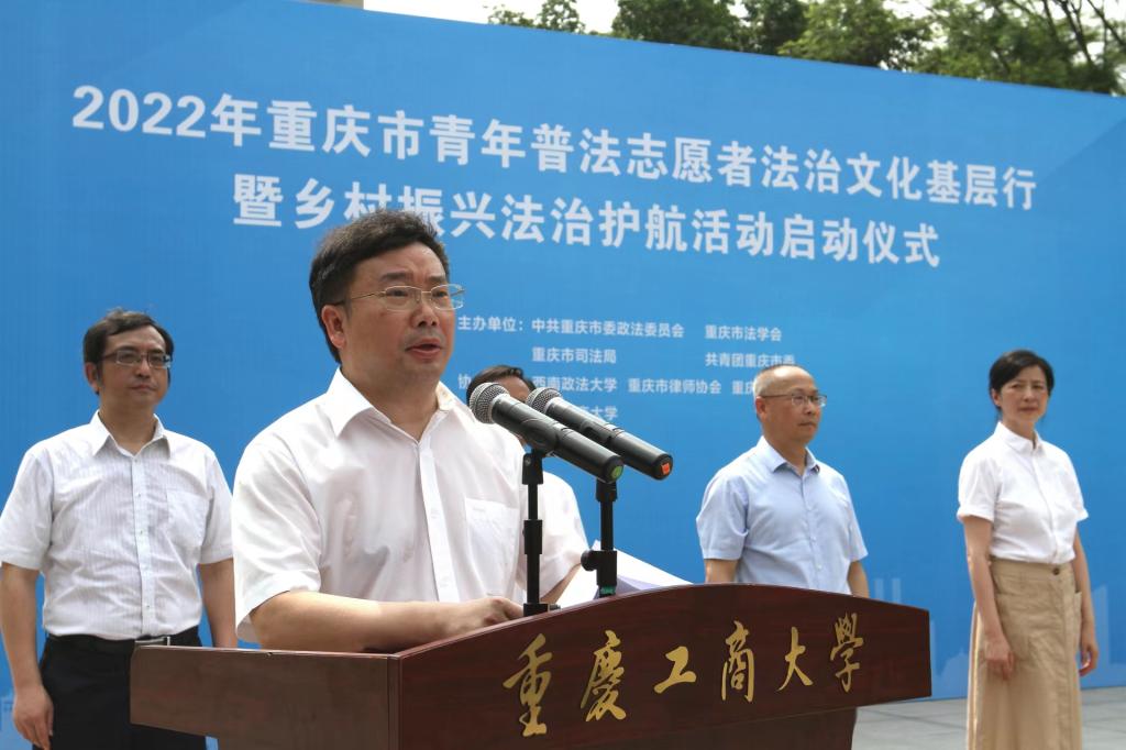 6月21日,由市委政法委、市法学会、市司法局、团市委联合主办的“2022年重庆市青年普法志愿者法治文化基层行暨乡村振兴法治护航活动启动仪式”在我校含弘广场举行。来自万搏网页版_万搏(中国)官方在线登录法学与社会学学院、西南政法大学民商法学院、重庆警察学院、重庆大学法学院、西南大学法学院、重庆邮电大学网络空间安全与信息法学院等法学院校大学生志愿者代表、市律师协会青年普法志愿者代表,市法学会民法经济法研究会、统筹城乡发展法治研究会、重庆法治报社乡村振兴法治护航中心,以及主城核心区的法学会、司法局、团区委,市乡村振兴局、团市委、市级政法各部门有关负责人以及我校有关领导参加了启动仪式。