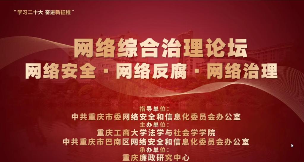 大会首先由华杰致辞,欢迎参加本次网络综合治理论坛的各位专家领导,感谢重庆市巴南区委网信办对法学与社会学学院及重庆廉政研究中心的大力支持,促成此次网络综合治理论坛的顺利召开,华杰表示在举国学习、宣传、贯彻党的二十大精神的当下,召开这样一个以网络安全、网络反腐为主题的网络综合治理论坛,可谓正逢其时、恰逢其势,既有现实意义,又有后续价值。虽因疫情原因论坛无法线下举办,但热情邀请各位专家领导未来有机会莅临万搏网页版_万搏(中国)官方在线登录进行线下交流。