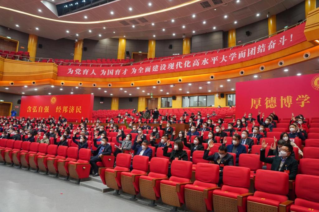 大会号召,全校各级党组织、全体共产党员和师生员工要更加紧密地团结在以习近平同志为核心的党中央周围,高举中国特色社会主义伟大旗帜,深入学习贯彻落实党的二十大精神,大力弘扬伟大建党精神,坚定信心、同心同德,真抓实干、奋勇前进,在市委、市政府的坚强领导下,在全面建设特色优势突出、国际知名的现代化高水平大学的历史新起点上,在以中国式现代化全面推进中华民族伟大复兴的时代征程中作出新的更大贡献!