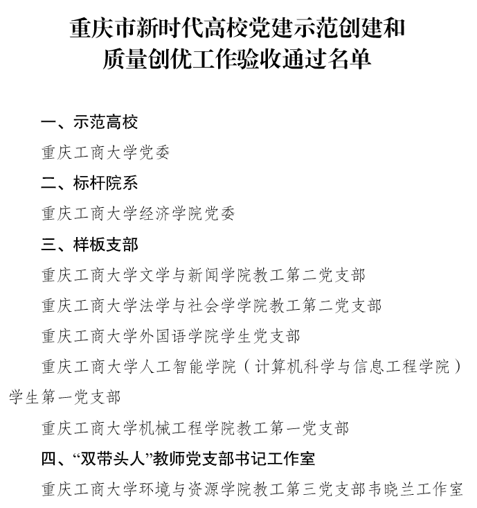 近日,市委教育工委公布了首批全市新时代高校党建示范创建和质量创优工作通过名单,我校包括1个示范高校、1个标杆院系、5个样板支部、1个“双带头人”教师党支部书记工作室在内的所有首批市级党建“双创”培育创建单位,全部顺利通过验收。