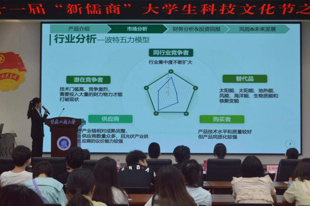 本次比赛共收到作品121份作品,经过初赛的严格筛选,共有8支团队脱颖而出,进入决赛。决赛项目具有创新性和实用性,有轻办公系列的二合一订书压平机,还有为同学服务的Games赛事通,更有分体式可循环快递箱等技术创新的便民项目。决赛中,各支队伍准备充分,围绕产品或服务特性、市场分析、商业模式、财务分析、风险防范、发展愿景等方面进行项目展示,思路清晰,有理有据。项目答辩环节,评委老师们结合参赛队伍的作品特点与涉及的金融投资相关专业性问题进行提问,选手们积极思考和回应,体现出较好的思辨精神和专业素养。经过紧张而精彩的角逐,最后“钳所未有队”与“赛事通小队”荣获一等奖。