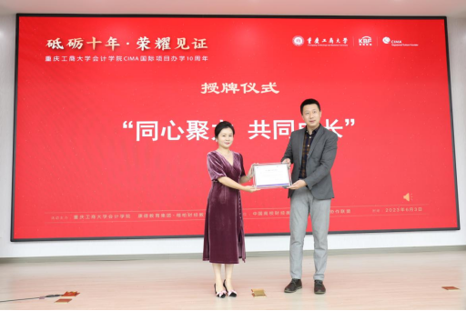 为感谢学校、学院在国际项目中做出的成绩,楷柏财经教育向会计学院授予“卓越教学实践单位”荣誉牌,会计学院本科教指委主任李定清教授与楷柏财经教育总经理李飞共同揭牌。CIMA公会向学校授予“同心聚力,共同成长”十周年纪念牌,郭敏代表学校接受了CIMA公会朱楚原先生的授牌。