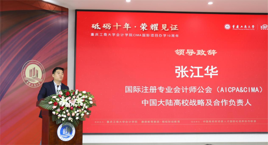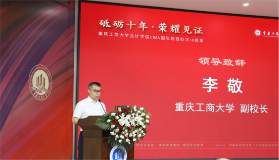 李敬为CIMA国际项目办学十周年致辞。他介绍了我校的国际化开放办学经验和历程,充分肯定了会计学院国际化项目的办学理念,对财务管理专业CIMA国际项目创办十年的丰硕办学成果给予高度赞扬,希望学院紧紧抓住学校快速发展和国际化机遇,与时俱进、砥砺前行,持续提高CIMA国际项目的办学水平,培养出更多高水平的国际化管理会计人才。