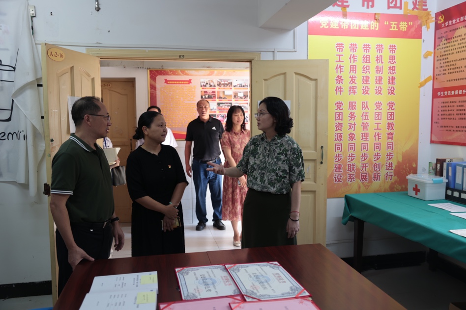 检查组一行首先实地查看了学生宿舍,详细了解了学生学习、生活情况。在参观学生宿舍里的“党员服务站”时,金玲对党员服务站取得的成绩表示充分肯定,并希望党员服务站和学院辅导员能够多措并举,组织学生开展形式丰富的各项活动,不断提升学生思想政治工作实效和质量。