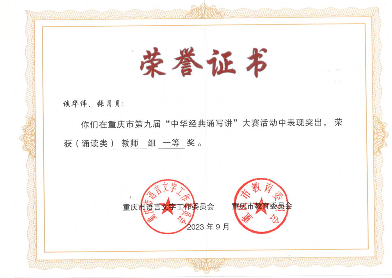 日前,重庆市教育委员会公示了2023年重庆市第九届“中华经典诵写讲”大赛(诵读类)获奖名单,我校文学与新闻学院谈华伟、张月月博士作品《长江自有后来人》获教师组一等奖。