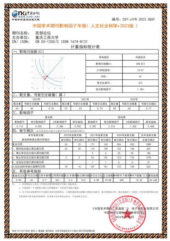 近日,中国科学文献计量评价研究中心和清华大学图书馆联合发布了《中国学术期刊影响因子年报(人文社会科学·2023版)》。其中,我校学术期刊《西部论坛》影响因子提升幅度较大,复合类影响因子首次突破“4”,达4.112,较2022年提升了32%;综合影响因子为2.302,较2022年提升了35.9%;综合影响力的学科排序为10/47。自2016年开始进行分区排序以来,本刊已连续“八年”入选“中国经济”类Q1区。
