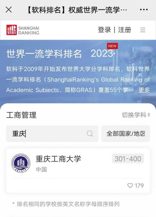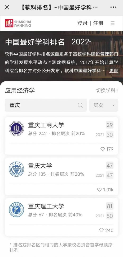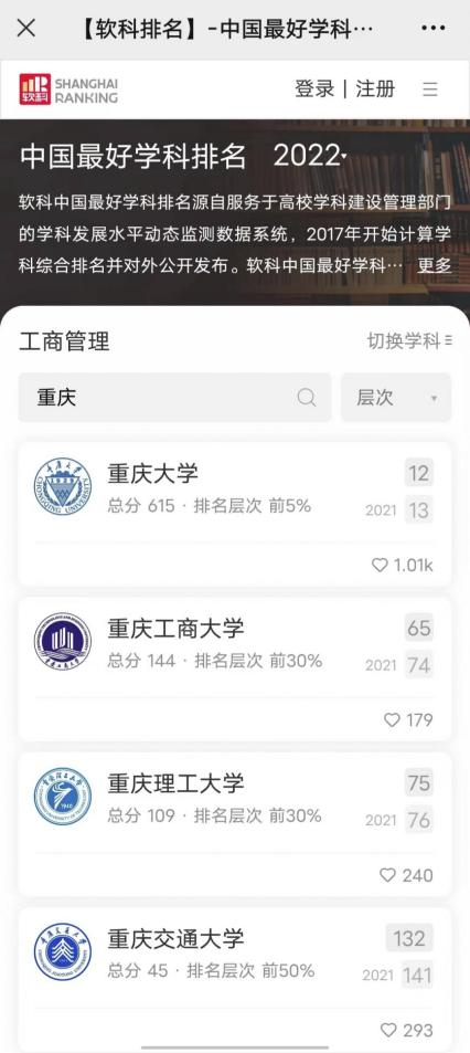另悉,在2022年软科公布的“中国最好学科排名”中,我校应用经济学学科排名全国第29位,居重庆市第一位;工商管理学学科排名全国第65位(较2021年上升9位),列重庆市第二。
