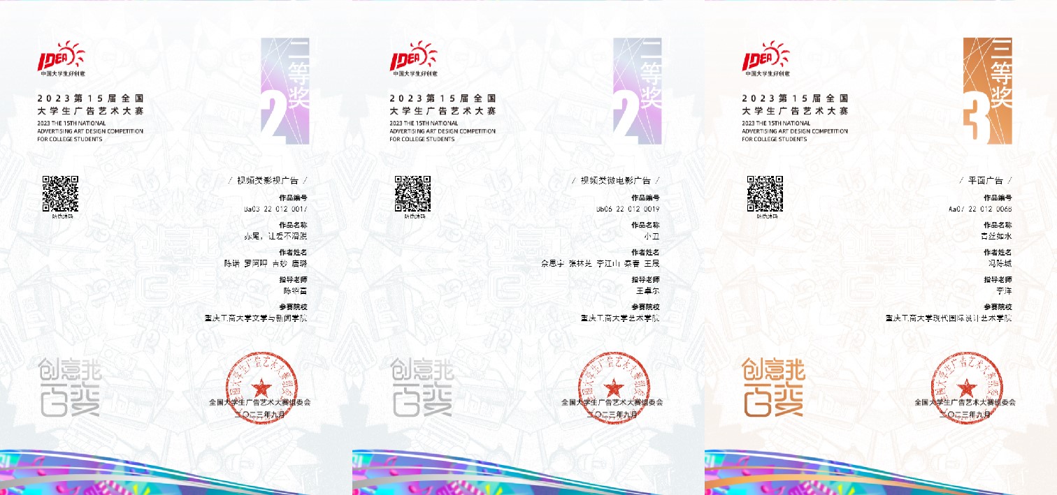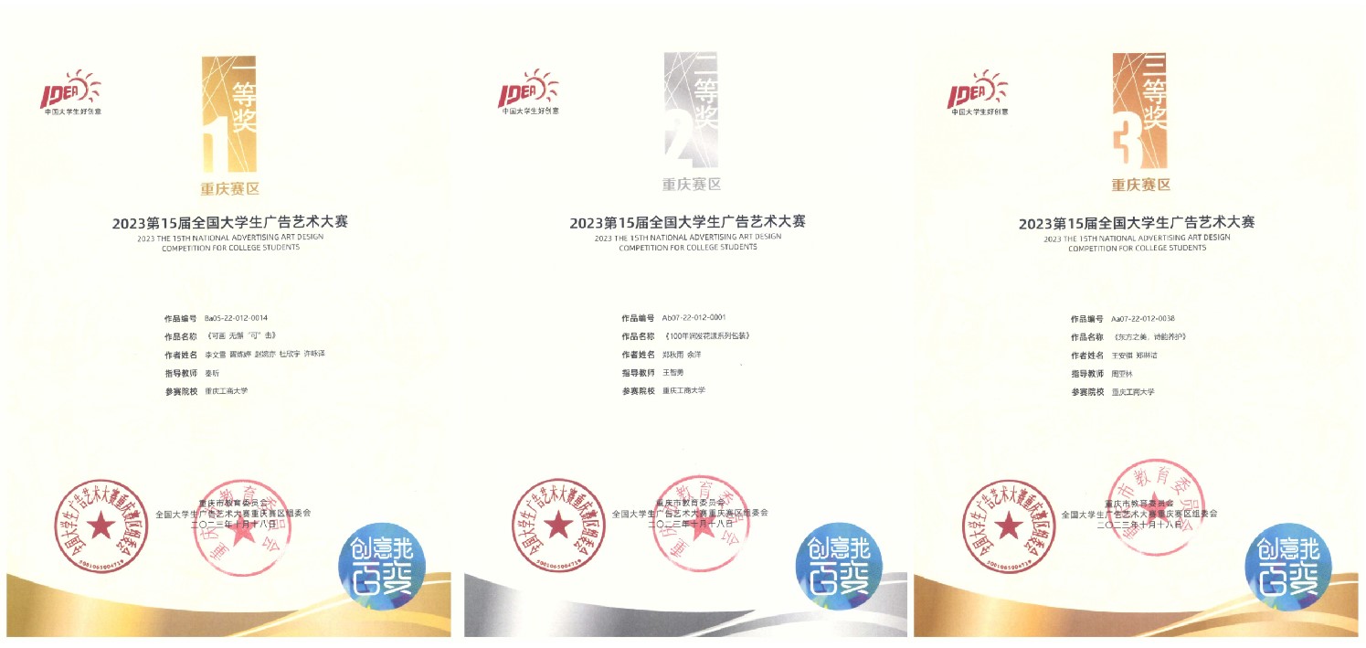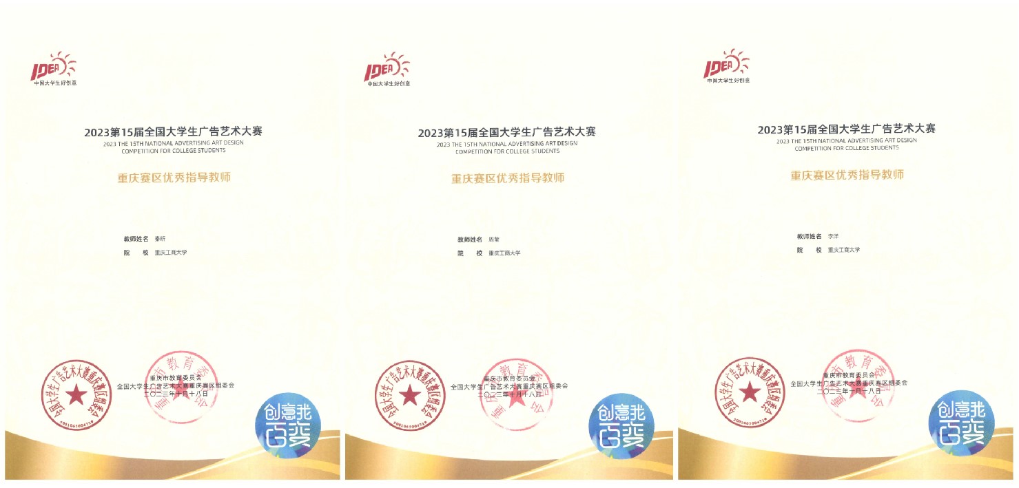 近日,第十五届全国大学生广告艺术大赛(以下简称:大广赛)获奖名单公布,我校学生在专业教师指导下的参赛作品获全国赛区二等奖4项、三等奖6项、优秀奖25项;重庆赛区一等奖9项、二等奖9项、三等奖51项、优秀奖203项。艺术学院秦昕、黄薇、王卓尔,现代国际设计艺术学院李洋,文学与新闻学院王烨、周莹6名老师荣获重庆赛区优秀指导教师。