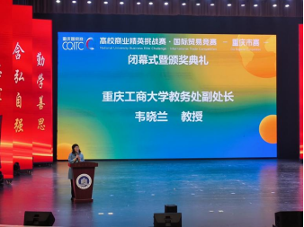 闭幕式暨颁奖典礼上,韦晓兰致辞。她首先对各位领导、评委和各院校师生的到来表示热烈欢迎。韦晓兰指出,每年一届的高校商业精英挑战赛国际贸易竞赛重庆市赛是我校承办的大型经贸类学科竞赛,是重庆市各高校同学及老师交流的重要平台。我校也将借此次竞赛为契机进一步为重庆市学科竞赛教育服务贡献力量。