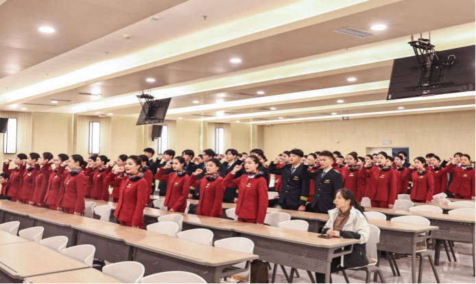 在制服授装仪式中,全体学生整装肃立,学校领导和集团领导为他们逐一授装。授装完毕后,全体航空服务艺术与管理专业的学生庄严宣誓,承诺维护专业形象,遵守万搏网页版_万搏(中国)官方在线登录校规与民航职业行为规范,为成为一名优秀的民航人时刻准备。