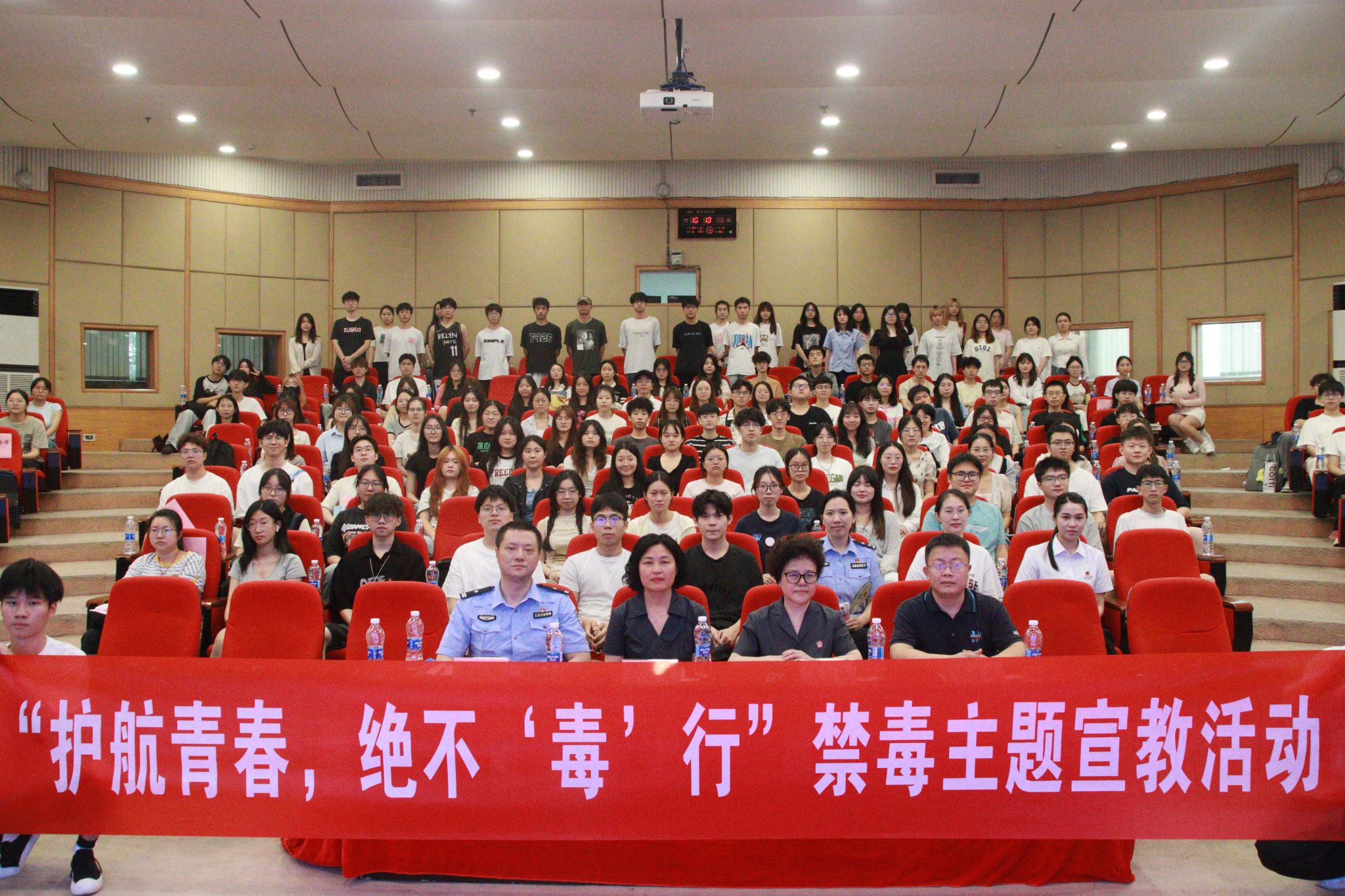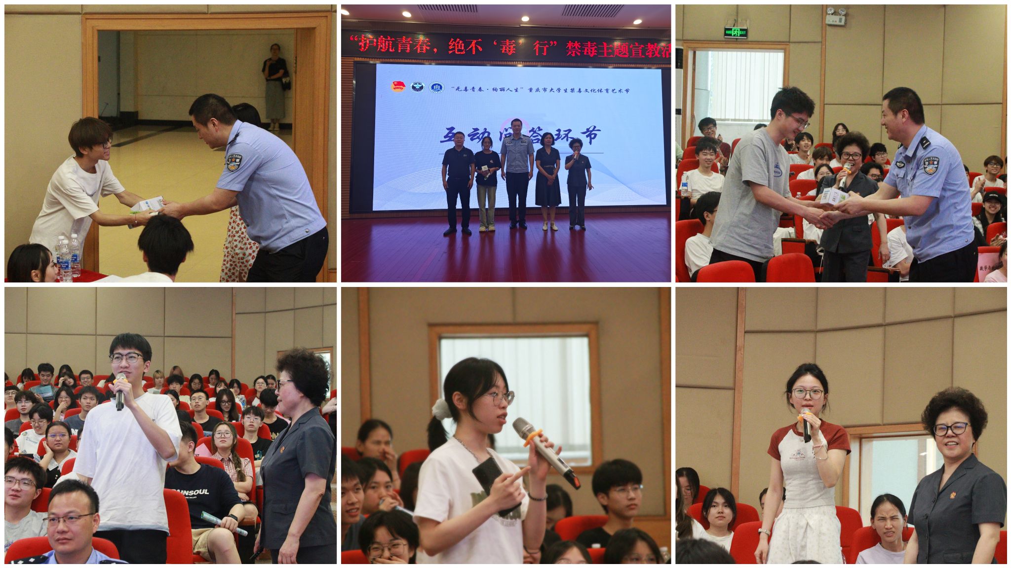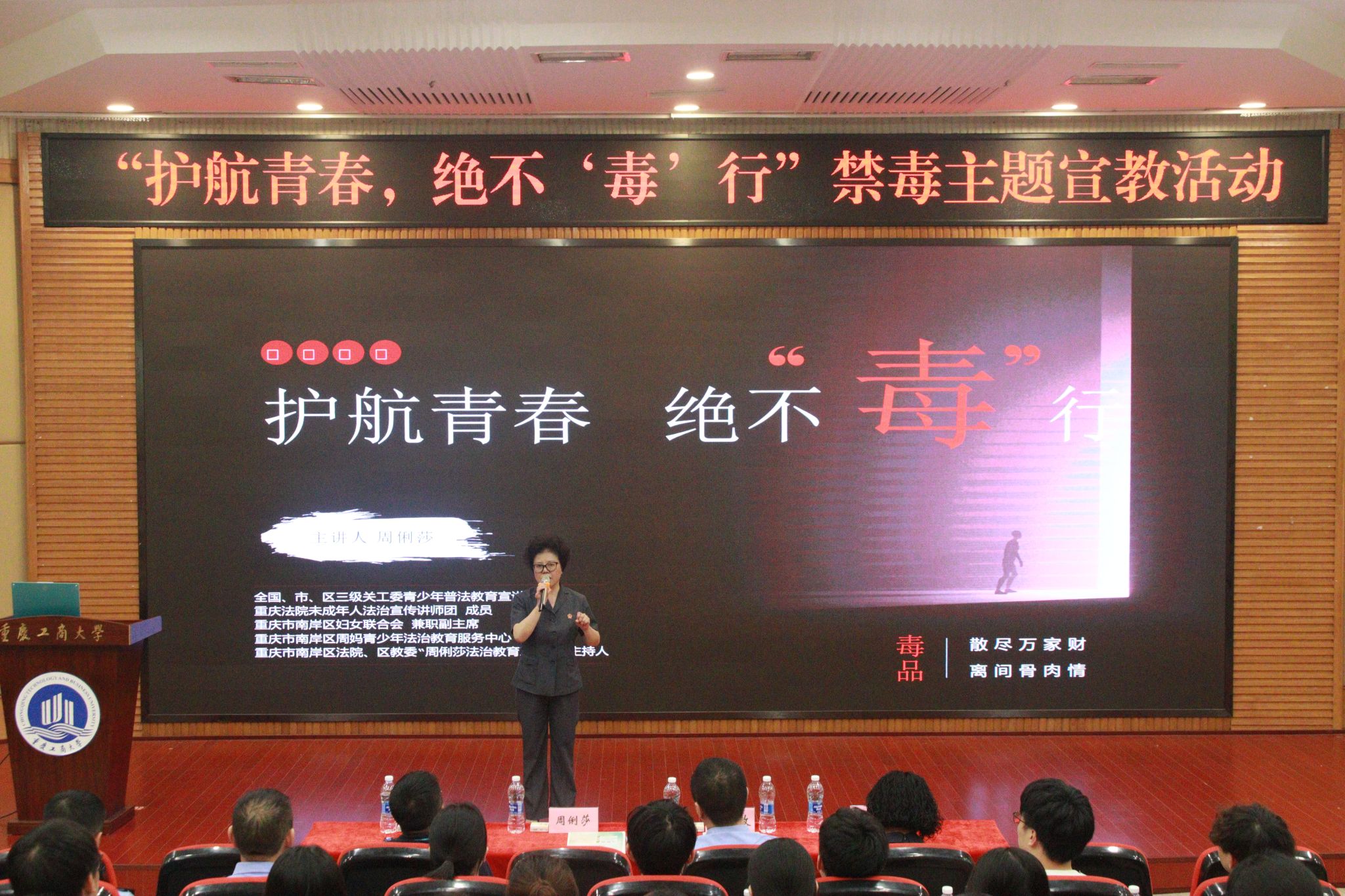 6月13日,南岸区禁毒办走进我校南岸校区,在博智楼7200报告厅向300余名师生开展“护航青春,绝不‘毒’行”禁毒主题宣教活动。全国青少年普法教育优秀辅导员、中华人民共和国最高人民法院“荣誉天平奖章”获得者、重庆市首届“十大法治人物”周俐莎,重庆市南岸区禁毒委员会办公室副主任邱智敏,校团委书记吴佑波,校保卫处副处长曹晓丽出席本次活动。