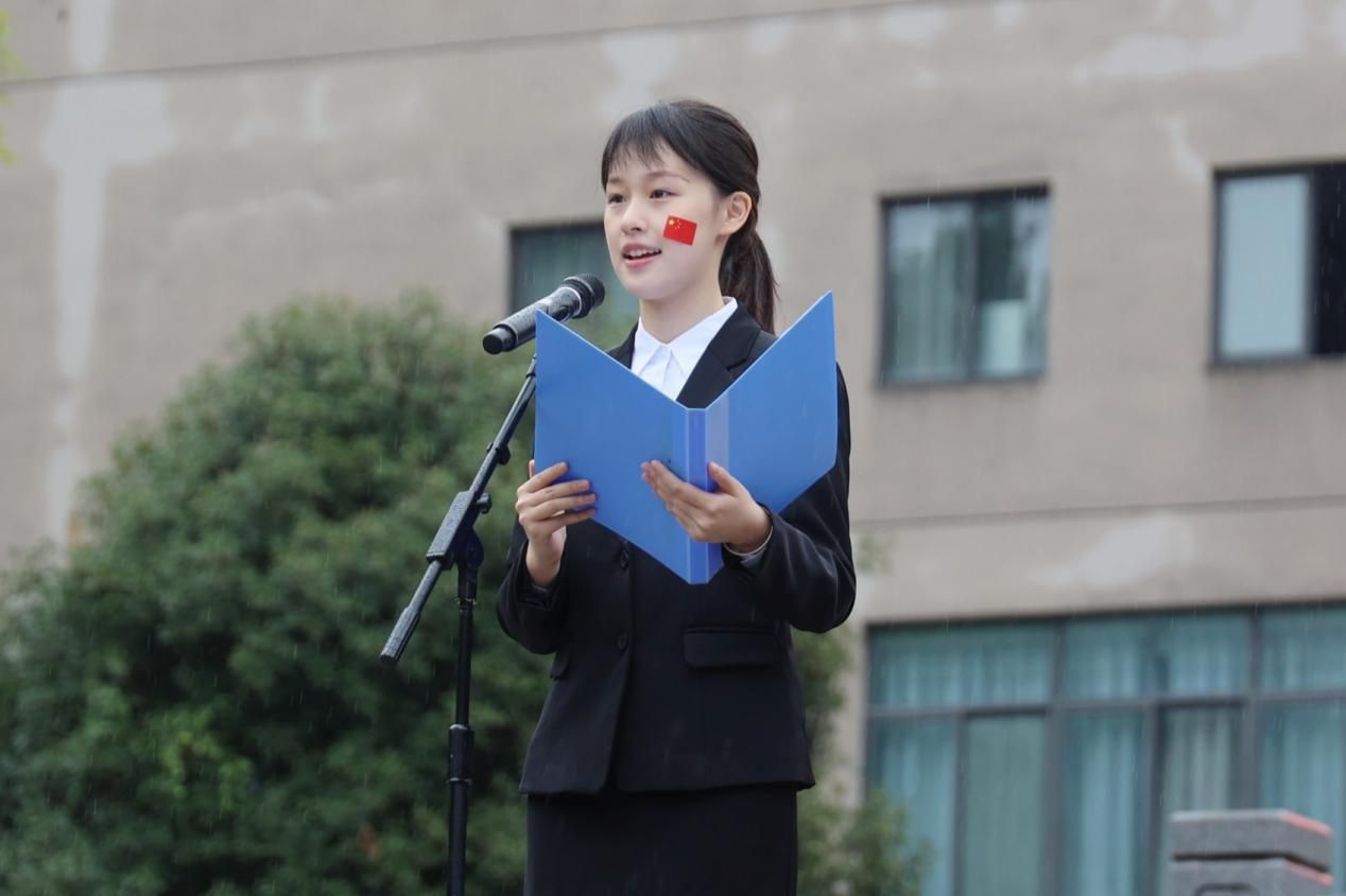 “行注目礼,升国旗,奏国歌!”当雄壮激昂的国歌奏响,升旗手迎风振臂一挥,五星红旗冉冉升起。在场全体师生员工在风雨中肃穆而立,致以注目礼。