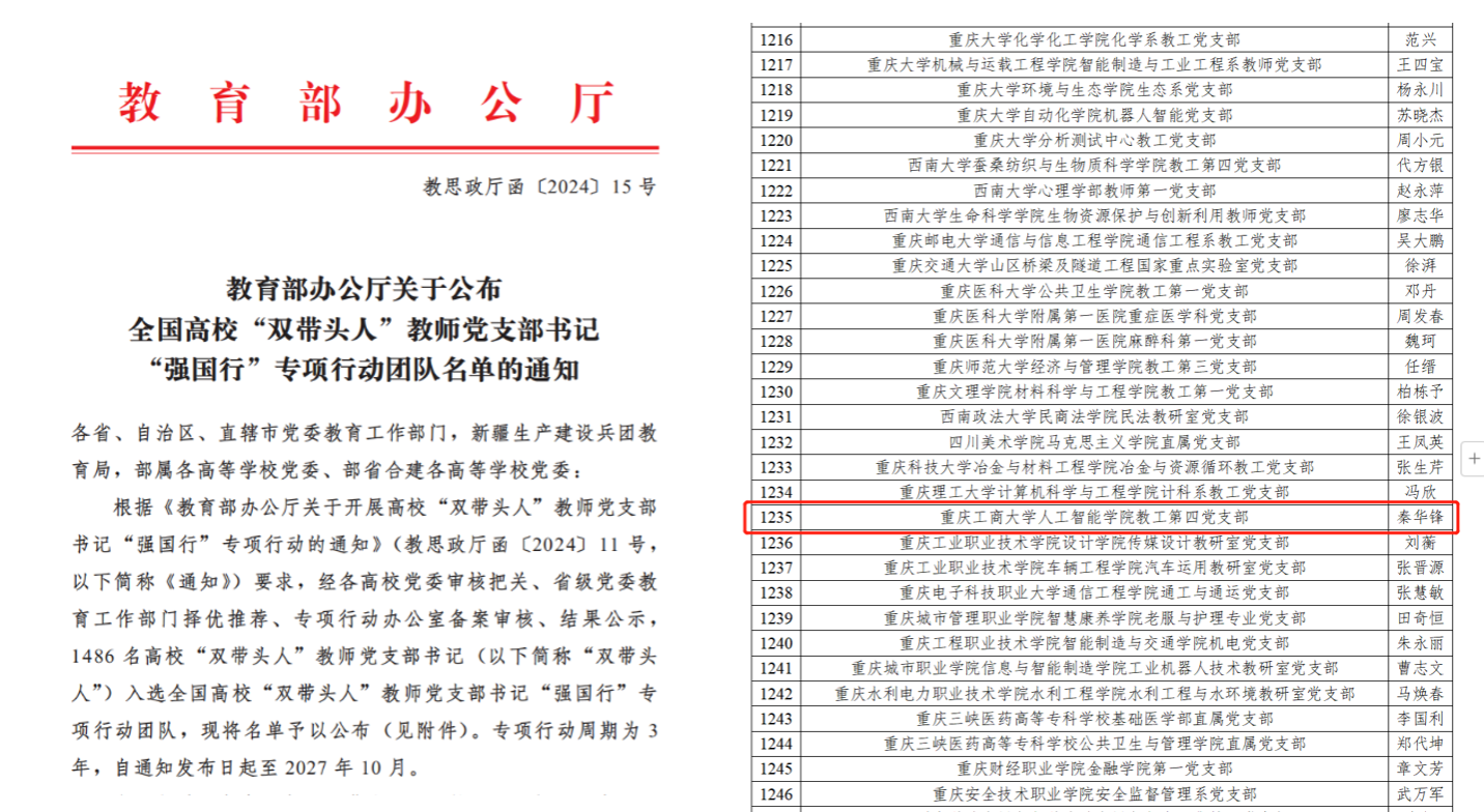 近日,教育部思政司印发了《关于公布全国高校“双带头人”教师党支部书记“强国行”专项行动团队名单的通知》,我校国合基地党支部(人工智能学院教工第四党支部)入选。