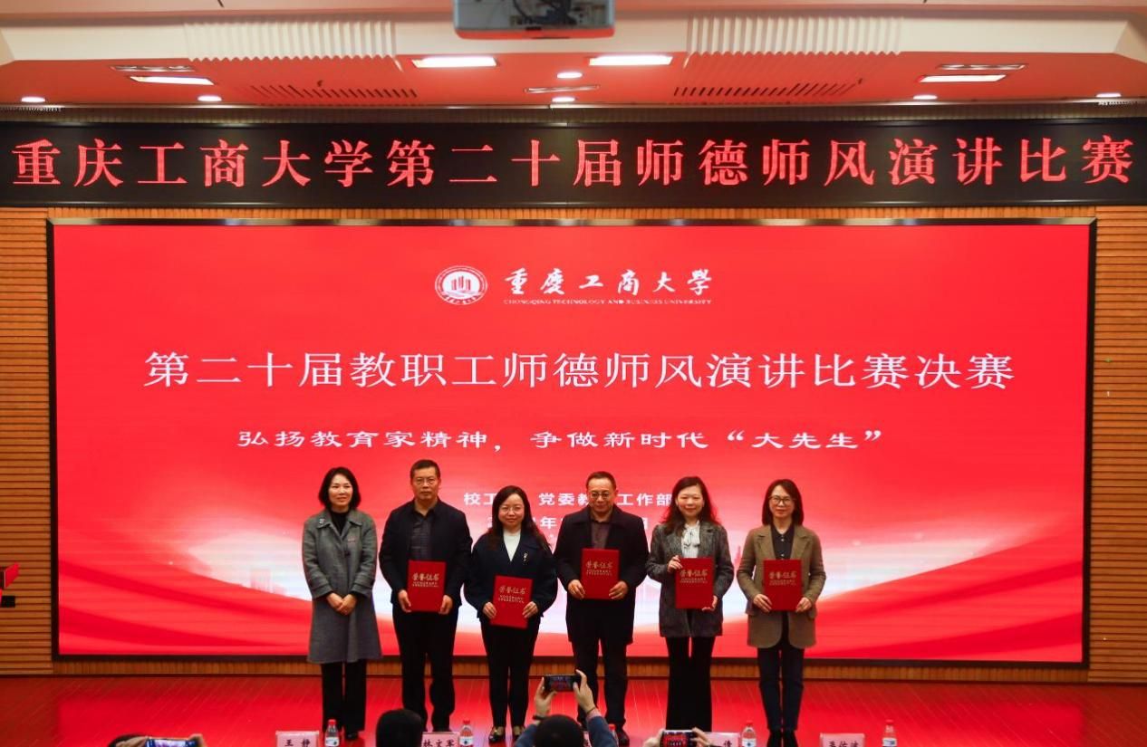 11月22日下午,由校工会、党委教师工作部联合举办的“立足新时代·当好主人翁·建功工商大”第二十届教职工师德师风演讲比赛决赛在博智楼7200学术报告厅举行。学校党委书记曾维伦,党委副书记、工会主席宋豫,党委常委、副校长张波、李国军,各学院党委/党总支书记、各部门工会主席以及教职工代表等观看了决赛。决赛邀请了重庆第二师范学院文学与传媒学院副教授魏巍,我校机关党委书记、组织部副部长杨倩,党委教师工作部部长、人事处处长林文军,工会常务副主席王静,团委书记吴佑波担任评委。