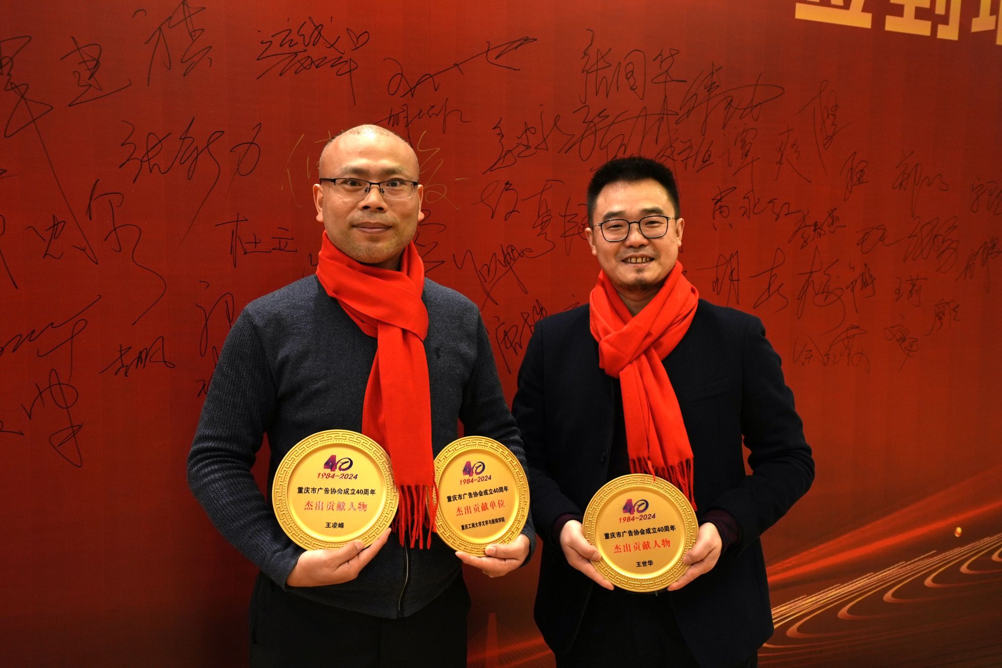 多年来,我校在广告与新媒体人才培养、广告与智能传播研究、广告与新媒体学科竞赛、公益广告大赛等方面为重庆市广告事业作出了积极贡献,取得了丰硕成果,大会授予我校文学与新闻学院“重庆广告四十年·杰出贡献单位”,授予文学与新闻学院广告系主任王凌峰、新闻系教师王世华“重庆广告四十年·杰出贡献人物”。