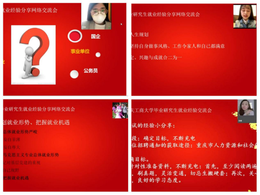 接下来四位研究生同学分享了他们的就业经验。来自文学与新闻学院2017级中国古代文学专业的陈蓉同学以“想考事业单位,如何高效准备”为题分享了成功考取事业单位的经验,她从如何确立目标,到怎么精准报考做了详细的介绍。2017级新闻学的荆笛同学刚从湖北返渝还在集中隔离,以“只要3招,让你在国企招聘中脱颖”为题,讲述了她国企招聘中遇到了众多优秀的应聘者,但她始终用“不惧”二字,在面对未知的领域时不惧,在面对强大的竞争者时不惧,鼓励自己最后成功拿到offer的故事。来自同样专业的郭欣蕊同学介绍了政府“招才引智”的人才引进计划,为很多不了解这个就业方向的同学们提供了新的就业思路。2017级马克思主义中国化研究专业的梁伟杰同学认为,作为一名党员现在正是面临各种单位招聘党务工作者的大好时机,他希望同学们要认清就业的形势,在国企、央企、私企等各种单位中拓宽自己的就业面,不要错失任何就业的机会。四位同学分别从求职信息渠道、备考经验、心态调整、人生规划等方面做了详尽的分享,在场的同学们对于事业单位、国企以及政府“招才引智”的应聘流程和细节都有了更详细的了解。