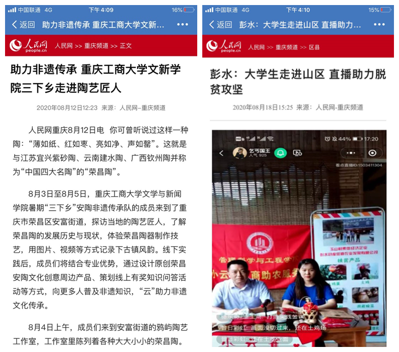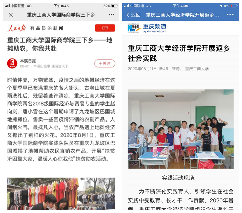 我校本次暑期社会实践覆盖全校19个学院,各学院实践队伍开设多种实践课程,形成多篇高质量调研报告和优秀文化作品,如《万搏网页版_万搏(中国)官方在线登录学子:青春之花绽于理想,脱贫之果结于家乡》、《没有生而英勇,只有选择无畏——国际商学院三下乡活动抗疫温暖》、《管理科学与工程学院:大学生走进山区,直播助力脱贫攻坚》等优秀三下乡社会实践调研作品,扎实推动习近平新时代中国特色社会主义思想在基层普及,广泛宣传了国家方针政策,充分践行了“不忘初心,牢记使命”的教育,发扬了“不怕吃苦,躬身实践”的志愿精神,为乡村振兴贡献了青春力量,不仅获得了当地政府、社会的认可,同时也被《人民日报》、《新华网》、《人民网》、《中国青年网》、《共青团中央服务青年发展部微信平台》、《中央广电总台国际在线》、《重庆共青团》官方网站、《重庆市教委官方微信平台》、《华龙网》、《重庆日报》、《彭水手机台》等多家媒体报道。