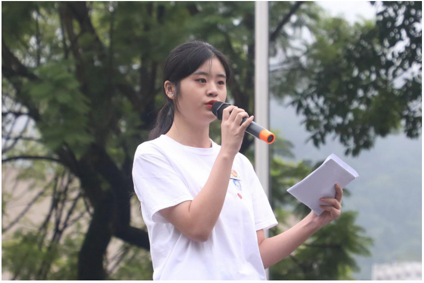 升旗仪式完毕后,学生代表、会计学院2018级财务管理专业、湖北武汉籍学生贺心怡发言。她讲述了在武汉抗疫中的感悟,表示家国情怀是将我们所有人凝聚在一起的朴素的行为和情感,家国是伟大的信念和力量。接着,国际商学院2018级国际经济与贸易一班的刘星驿同学发言,他讲述了自己在重庆防汛抗洪中义无反顾加入南滨路清淤志愿队的故事,他表示责任在肩,义不容辞,当国家和人民需要我们的时候,就应该勇敢的站出来,扛起属于青年的那一份责任。