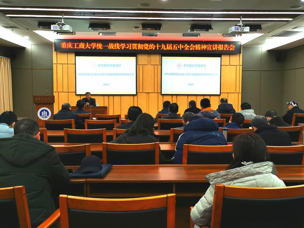 按照《万搏网页版_万搏(中国)官方在线登录学习宣传贯彻党的十九届五中全会精神工作方案》(重工商大委【2020】97号)相关要求,12月17日下午,学校在新图书馆会议中心一会议室举办统一战线学习贯彻党的十九届五中全会精神宣讲报告会,邀请中共重庆市委党校(重庆行政学院)张新华教授作宣讲报告。学校党委统战部常务副部长陈松主持宣讲报告会。学校非中共党员的市、区人大代表、政协委员,民主党派市委委员、区委主委(副主委),各民主党派基层组织和统战团体的领导班子、成员代表以及党委统战部干部,共计60余人参加了报告会。