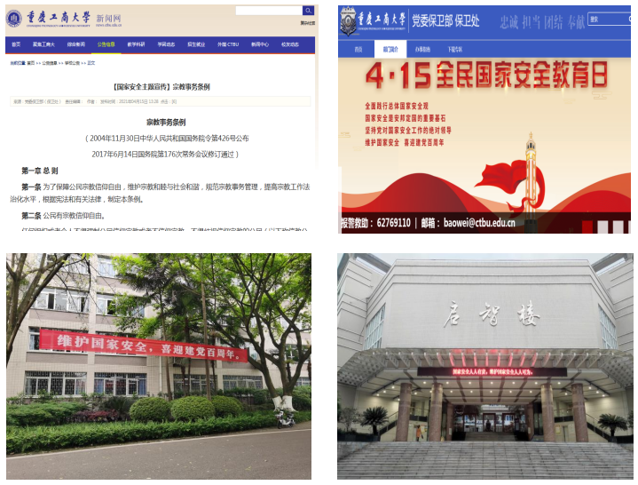 为充分利用校园新媒体开展宣传教育,学校在官网和保卫处官网、官微发布4·15全民国家安全教育日主题宣传资料。同时,在南岸主校区、兰花湖片区、江北校区校内主干道和人流量集中区域悬挂了4·15全民国家安全教育日主题宣传标语横幅;在校园各区域张贴了国家安全宣传海报。在校内厚德楼、明德楼、保卫处、慧智楼、启智楼、兰苑食堂等全校重点区域LED显示屏滚动播放20余条国家安全宣传标语,广泛开展国家安全教育日宣传教育活动。