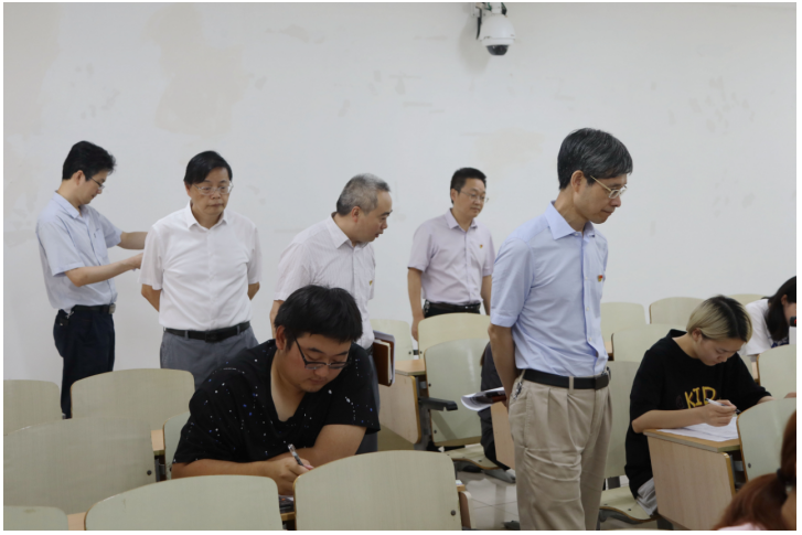 7月5日上午,校长孙芳城、副校长何勇平深入期末考试现场,对期末考试工作进行检查,学生处、教务处、教学质量监督与评估办公室等部门负责人陪同检查。