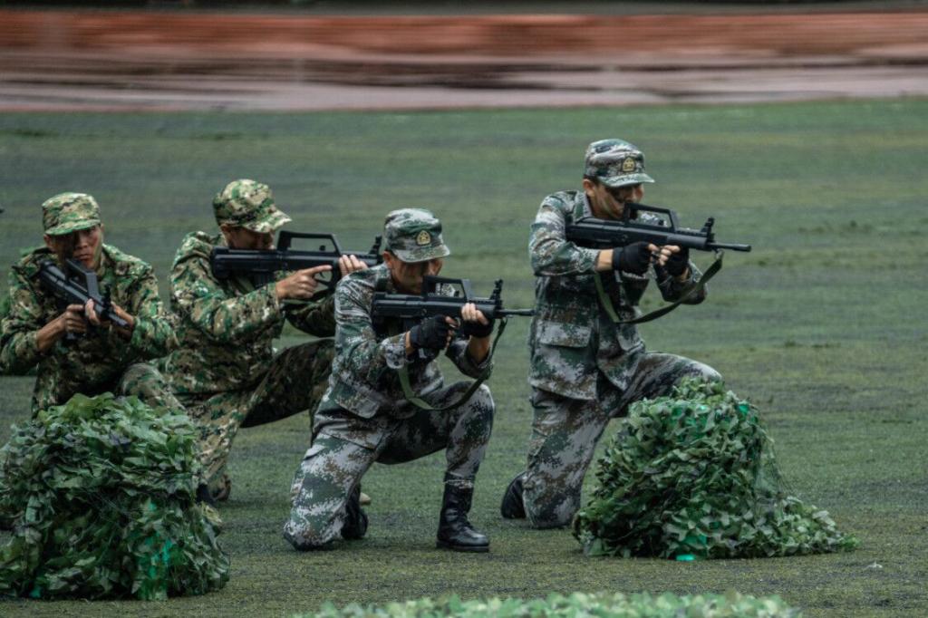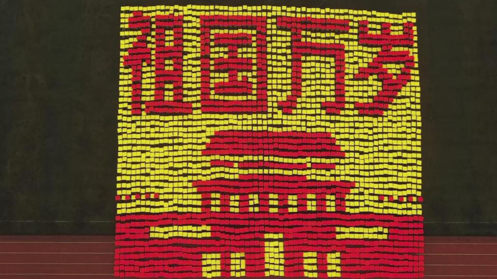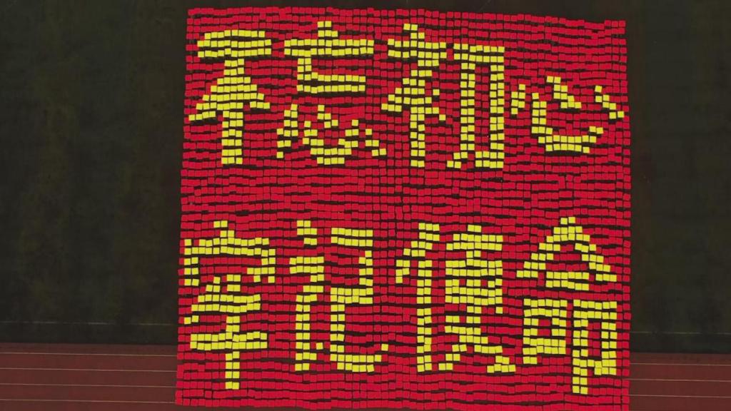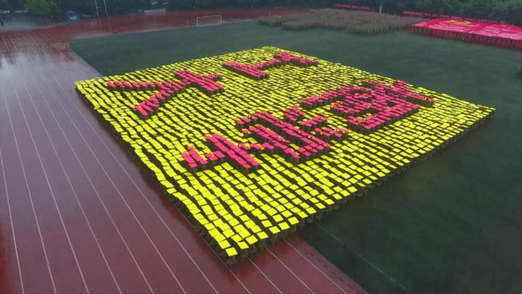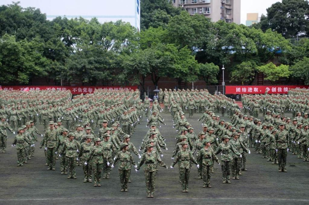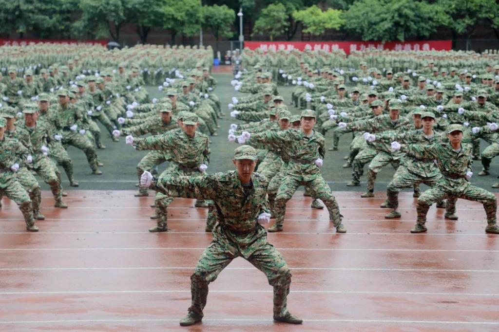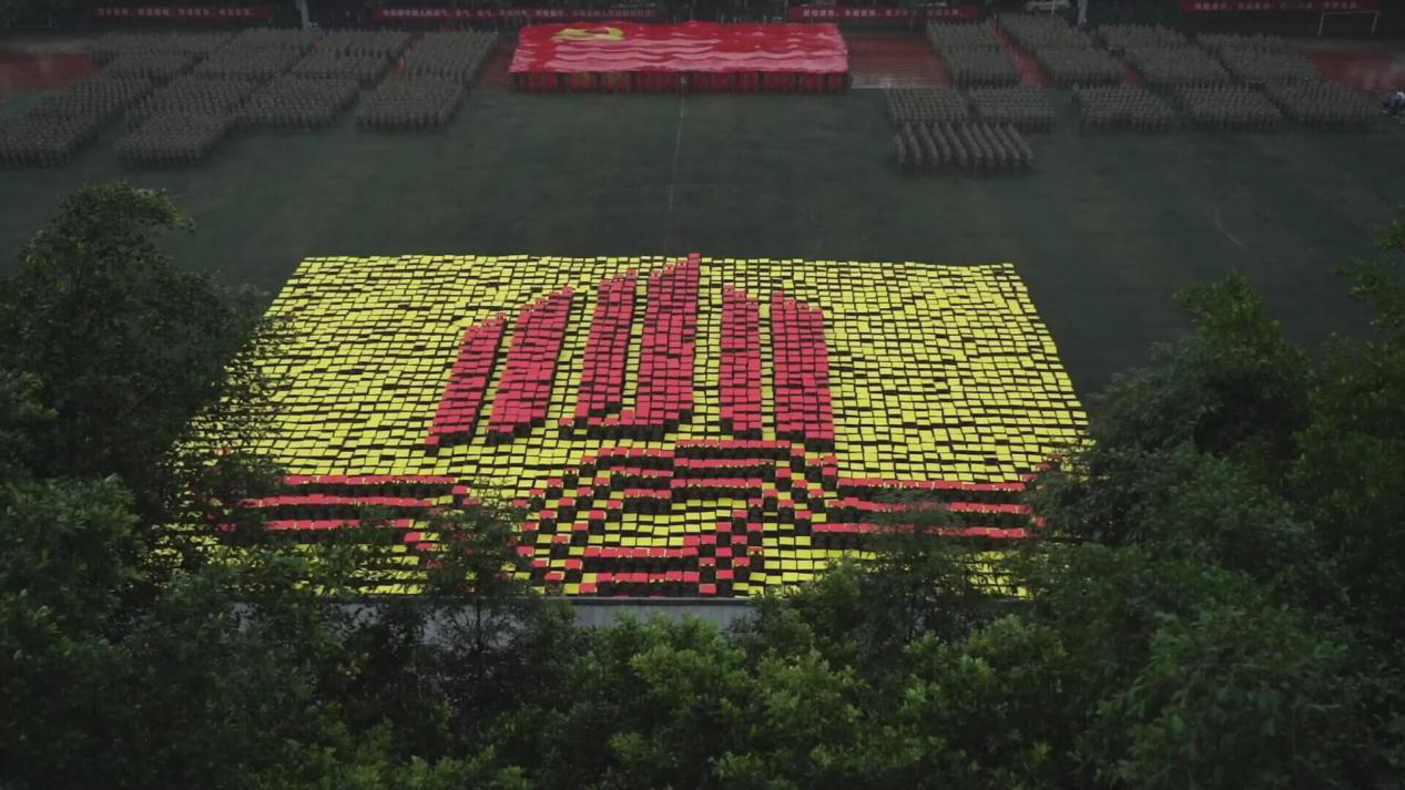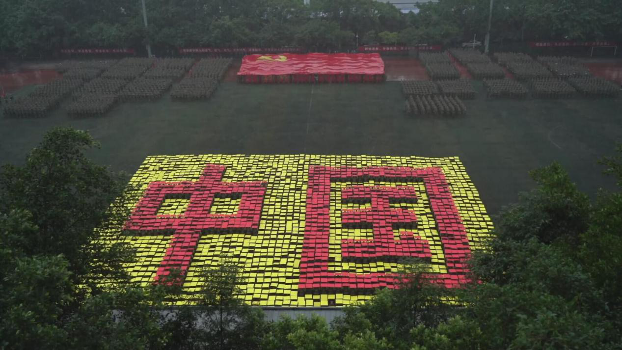 笼罩于淅淅小雨之下,分列式方阵精神饱满、昂首挺胸,齐步到正步的整齐变化体现的是队列同学的团结一心,他们以铿锵有力的步伐展示了我校学子自信昂扬的姿态;军体拳方阵气势磅礴,雄厚的声音吼出的是男儿的铁血方刚,他们以刚劲有力的动作彰显了重工商学子锐意进取的优秀品质;匕首操方阵势如破竹、英姿飒爽,男儿的豪迈气概和女孩的英姿飒爽相交融合,他们一齐展现了新时代青年朝气蓬勃的精神面貌。由退伍学生与体育学院健儿们组成的战术方阵用专业精彩、扣人心弦的表演描述了边防官兵保家卫国、不怕牺牲的英雄气概。复兴方阵以整齐划一的步伐迈向主席台,伴随着指挥员的解说词与大气恢弘的背景乐,2800名女生用红黄底板准确地摆出“1921”“2021”“红船”“天安门”“长城”“CTBU”“工商大学”“校徽”等图案,表达了对祖国大好河山的热爱之情,以及不忘初心跟党前行的坚定信念,当复兴方阵即将摆出“巨轮”图案之时,天空陡然降下瓢泼大雨,似印证其“长风破浪会有时,直挂云帆济沧海”的伟大理想。在党旗方阵的带领下,全体参训人员进行宣誓。