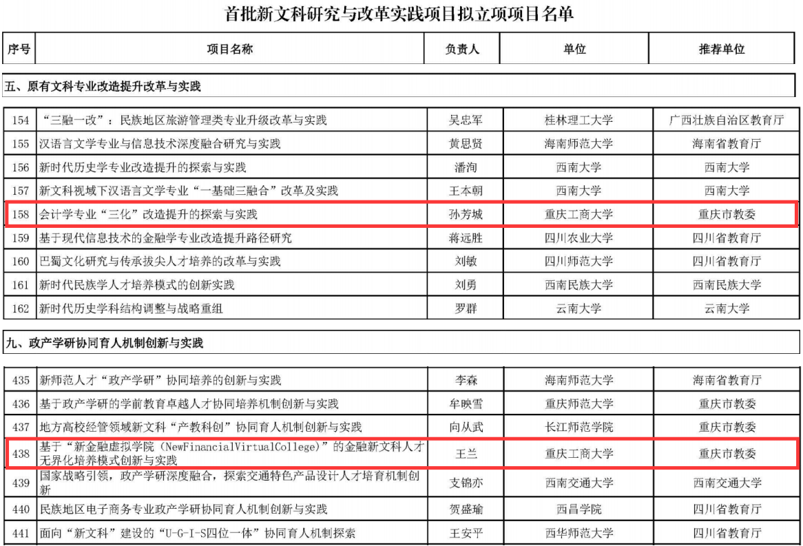 由校长孙芳城教授担任项目负责人的《会计学专业“三化”改造提升的探索与实践》入围原有文科专业改造提升改革与实践大类,由金融学院院长王兰教授担任项目负责人的《基于“新金融虚拟学院(NewFinancialVirtualCollege)”的金融新文科人才无界化培养模式创新与实践》入围政产学研协同育人机制创新与实践大类。