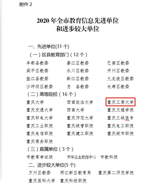 近日,重庆市教育委员会公布了《关于2020年教育信息工作情况的通报》,我校在全市高校信息工作中得分排名第三,被评为重庆市教育信息工作先进单位,党政办王洪同志被评为重庆市教育系统优秀信息工作者。