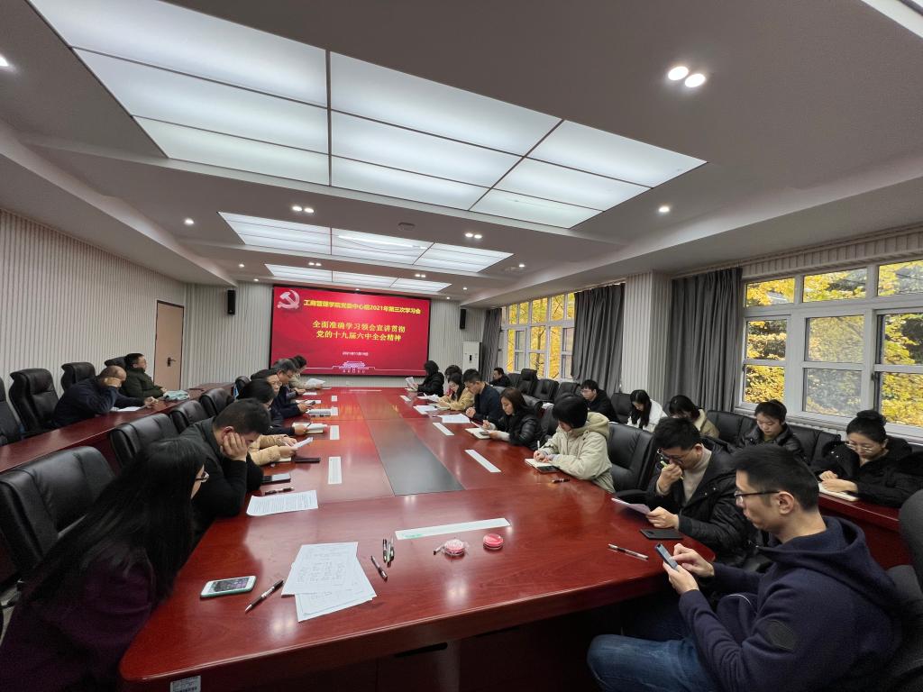 11月19日,工商管理学院党委在明智楼3020会议室召开2021年第三次中心组理论学习(扩大)会,集中学习中共十九届六中全会精神。会议由学院党委书记彭勇主持,学院领导班子、党委委员、工会委员、系主任、辅导员、行政人员和教师代表近50人参加了会议。