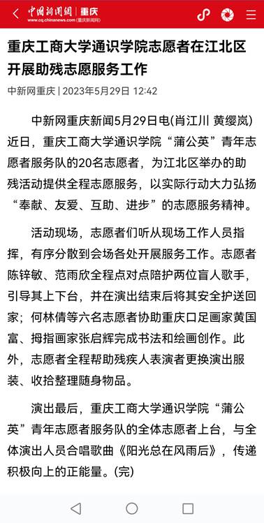 近日,央广网以《重庆学子开展“以青春之我,筑童心港湾”小学支教活动》为题,报道我校通识学院开展小学支教活动;中国新闻网以《万搏网页版_万搏(中国)官方在线登录通识学院志愿者在江北区开展助残志愿服务工作》为题,报道我校通识学院志愿者参与江北区助残活动。
