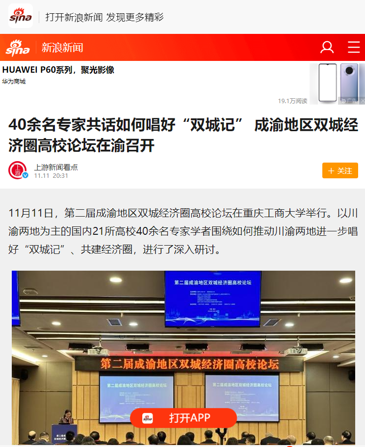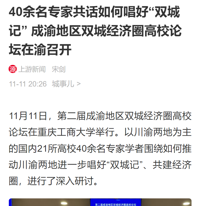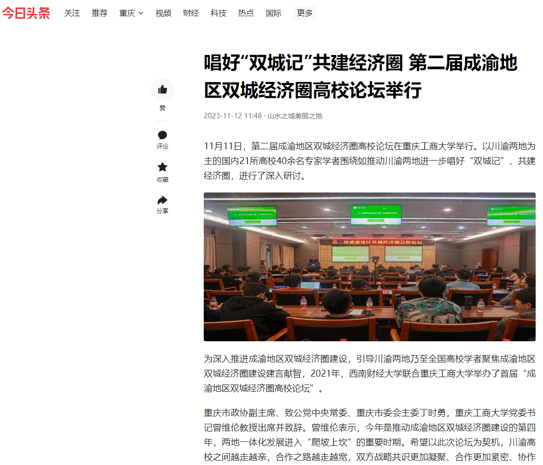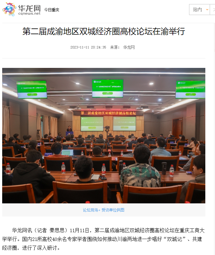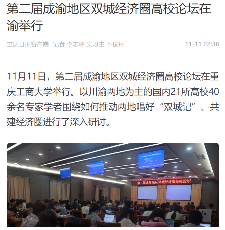 11月11日,由万搏网页版_万搏(中国)官方在线登录、西南财经大学主办,教育部人文社会科学重点研究基地长江上游经济研究中心、万搏网页版_万搏(中国)官方在线登录经济学院等单位联合承办的第二届成渝地区双城经济圈高校论坛在我校举办。重庆日报客户端、上游新闻、华龙网、今日头条等多家媒体对本次论坛进行了报道。