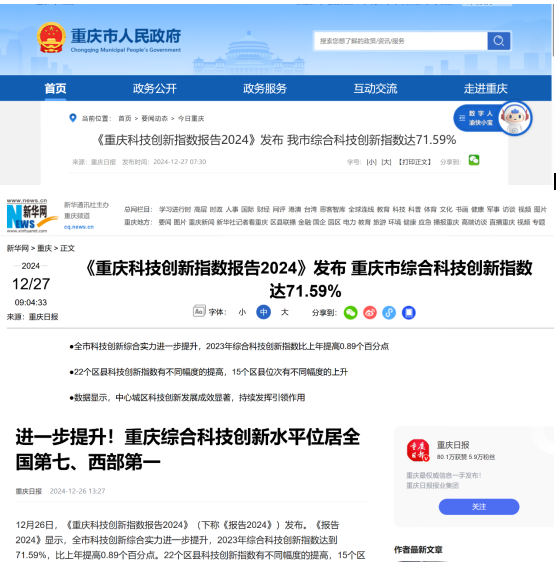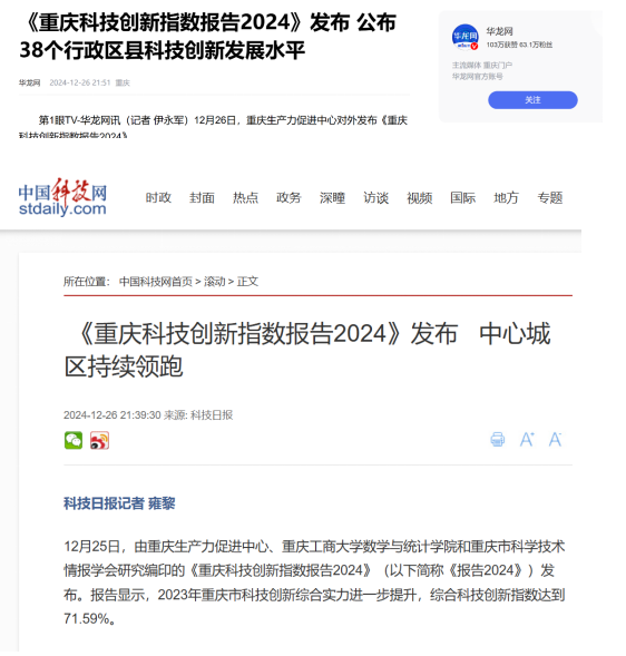 12月26日,重庆生产力促进中心、万搏网页版_万搏(中国)官方在线登录数学与统计学院、重庆市科学技术情报学会联合发布了《重庆科技创新指数报告2024》。该项校地合作成果被重庆市人民政府网站、新华网、重庆日报、华龙网、中国科技网等多家主流网站、媒体宣传报道。