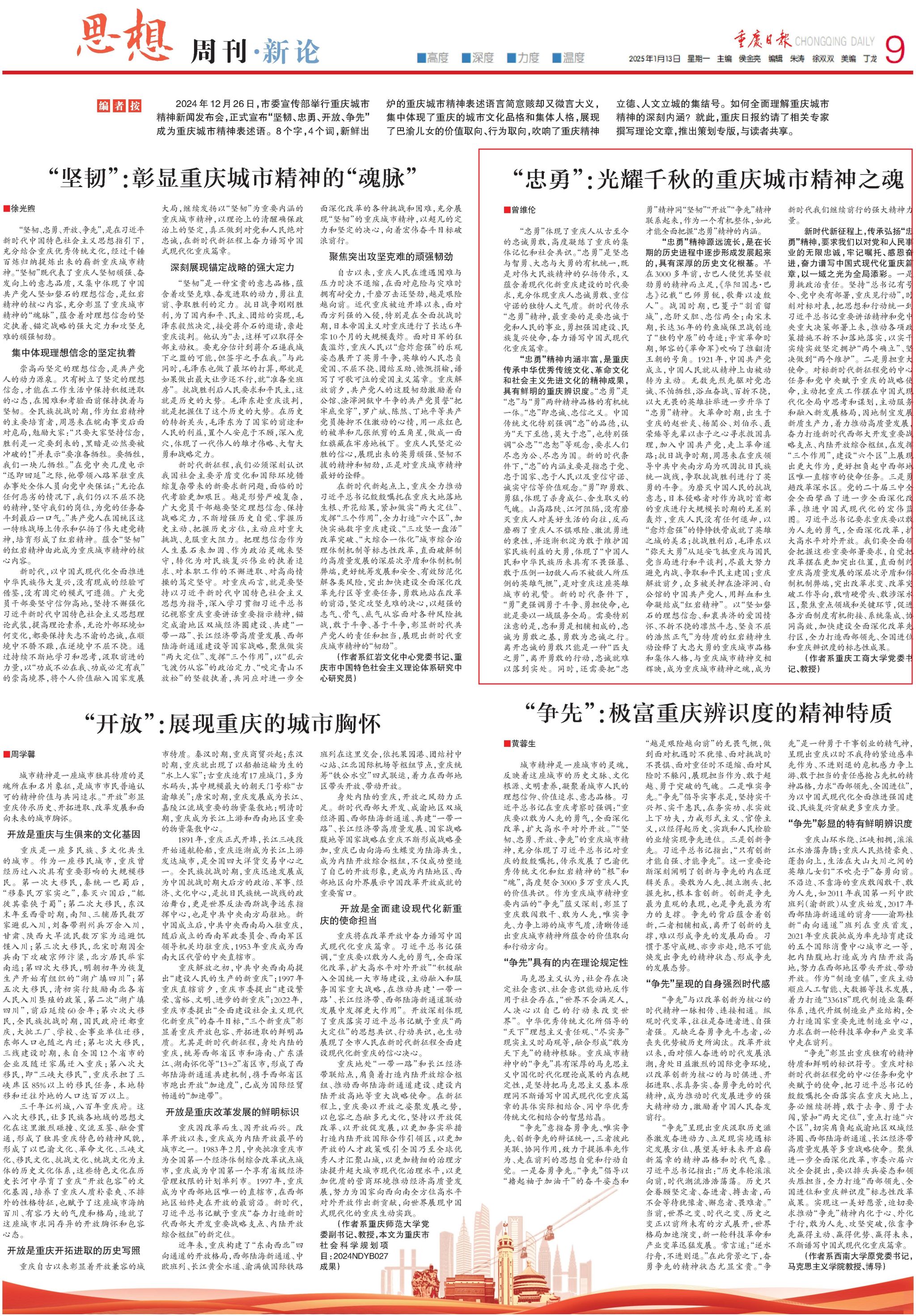 2025年1月13日,《重庆日报》思想周刊刊登了学校党委书记曾维伦教授撰写的题为《“忠勇”:光耀千秋的重庆城市精神之魂》的理论文章,为全面理解重庆城市精神的深刻内涵和奋力谱写中国式现代化重庆篇章贡献了我校专家的智慧。