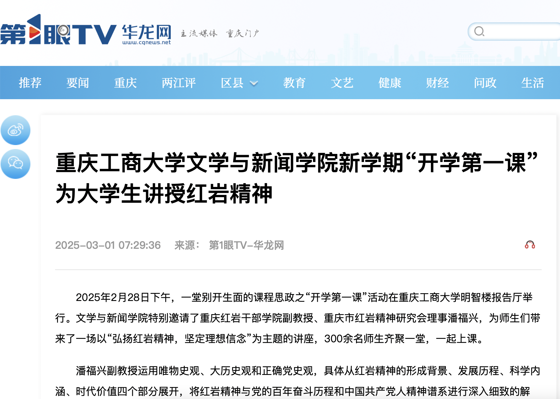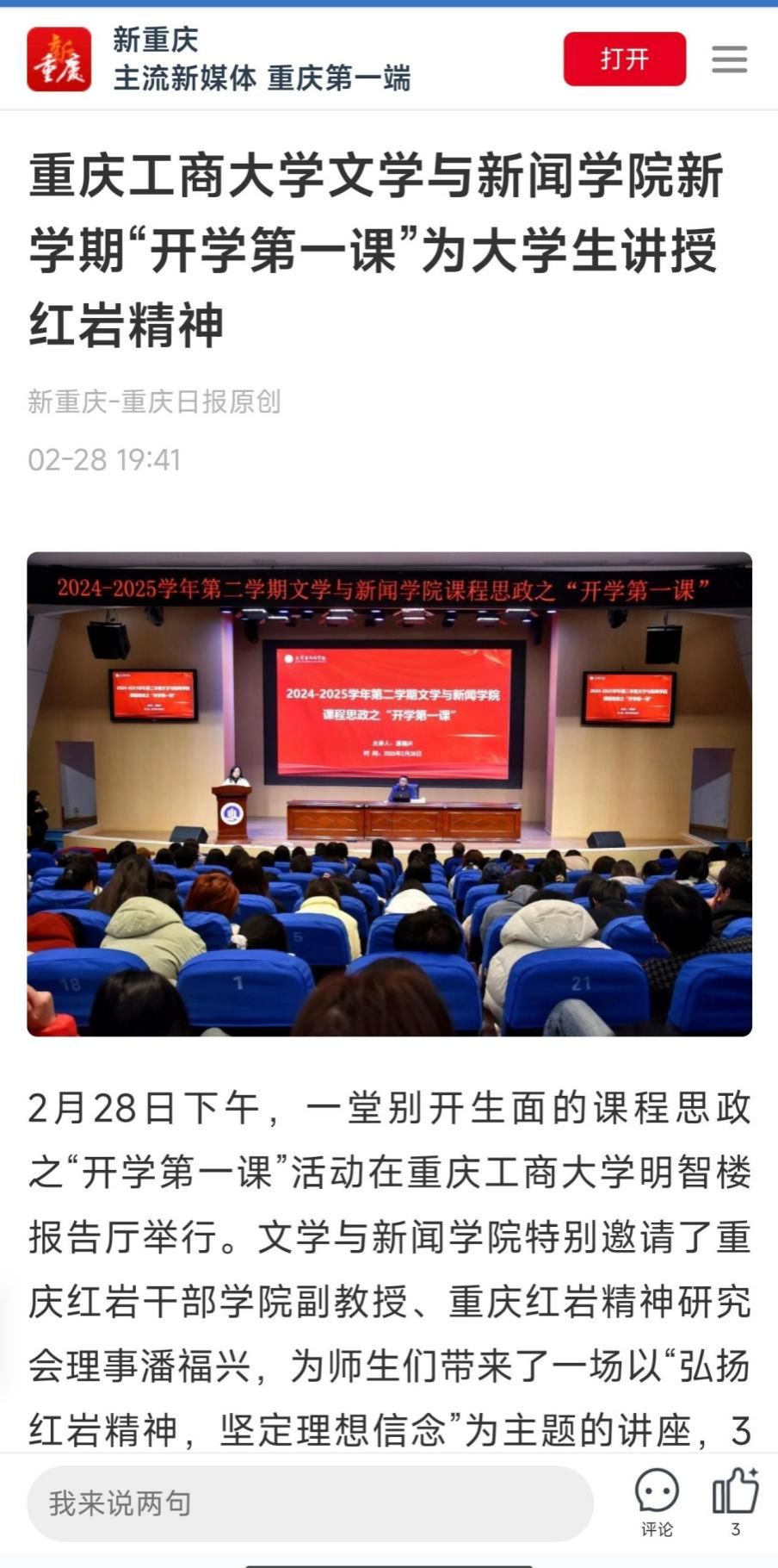 2月28日下午,学校文学与新闻学院课程思政之“开学第一课”活动在明智楼报告厅举行,邀请了重庆红岩干部学院副教授、重庆市红岩精神研究会理事潘福兴为师生们带来了一场以“弘扬红岩精神,坚定理想信念”为主题的讲座,300余名师生齐聚一堂,一起上课。