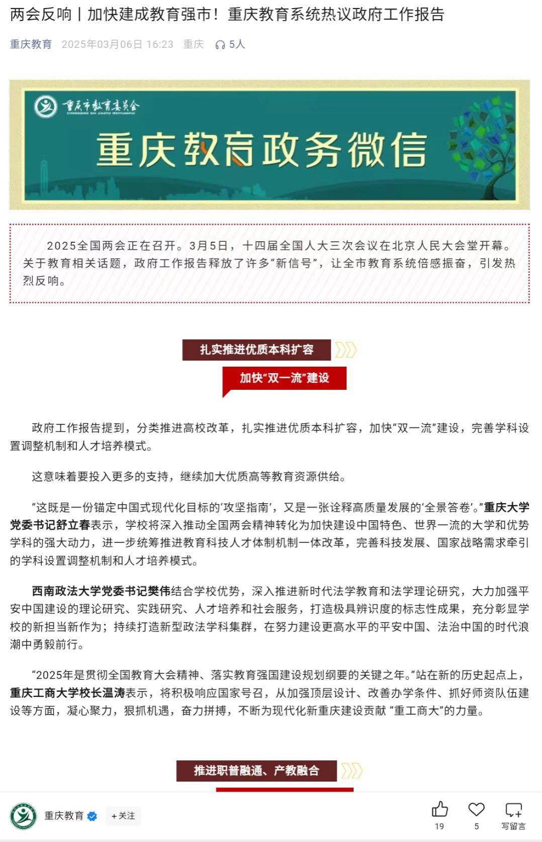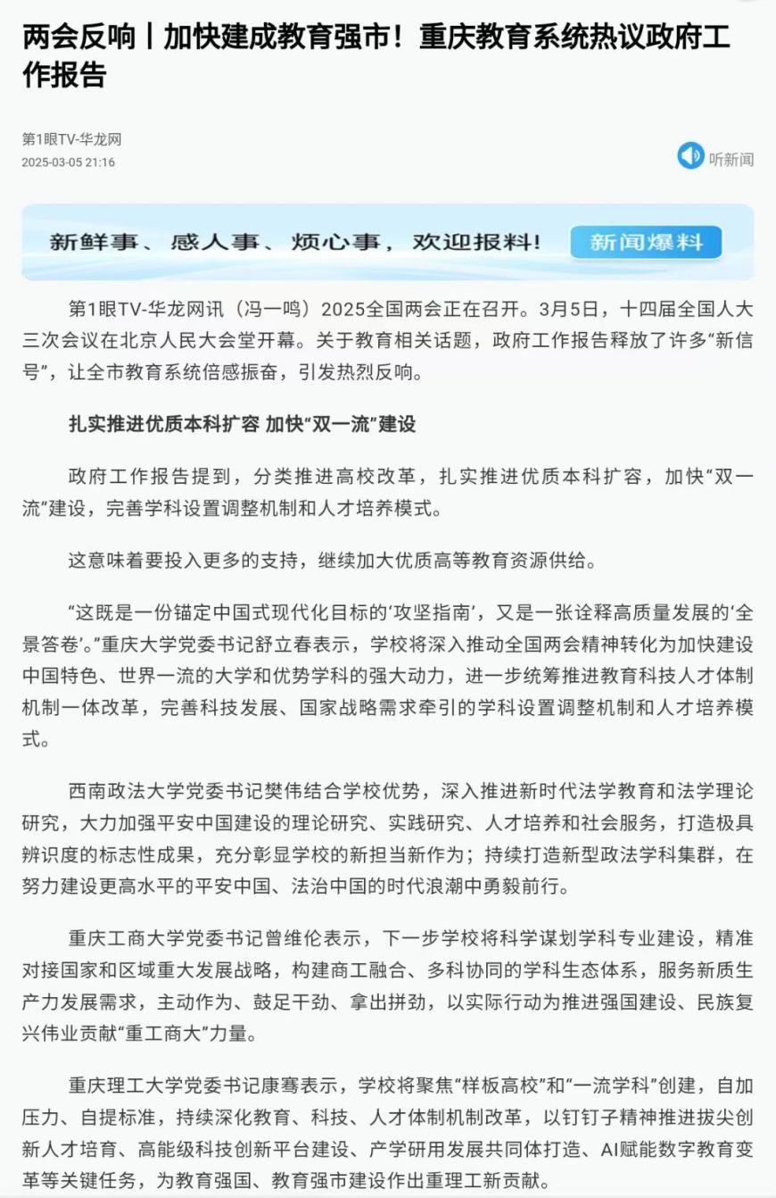 第一眼TV-华龙网和重庆教育公众号报道我校干部师生热议2025年政府工作报告