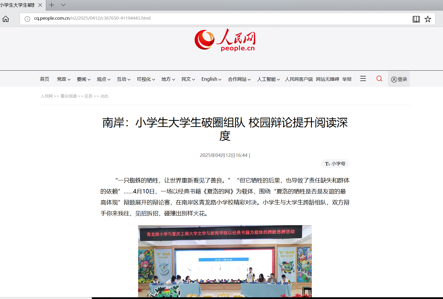 为深化新课标“核心素养”导向,践行“生活阅读”特色课程理念,4月10日,青龙路小学与万搏网页版_万搏(中国)官方在线登录文学与新闻学院联合举办的“书香激辩·智慧碰撞”跨龄思辨活动在青龙路小学青蓝讲堂圆满收官。该活动以经典书籍《夏洛的网》为载体,通过“深度阅读+思辨实践”的创新模式,搭建高校与小学的智慧对话桥梁。人民网以《南岸:小学生大学生破圈组队 校园辩论提升阅读深度》为题报道该活动。