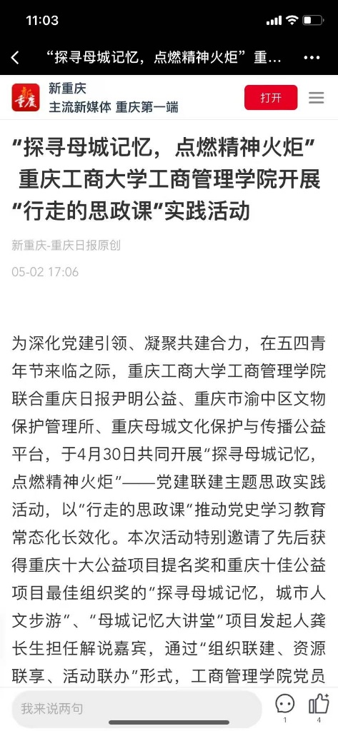 2.新重庆-重庆日报:《“探寻母城记忆,点燃精神火炬”万搏网页版_万搏(中国)官方在线登录工商管理学院开展“行走的思政课”实践活动》