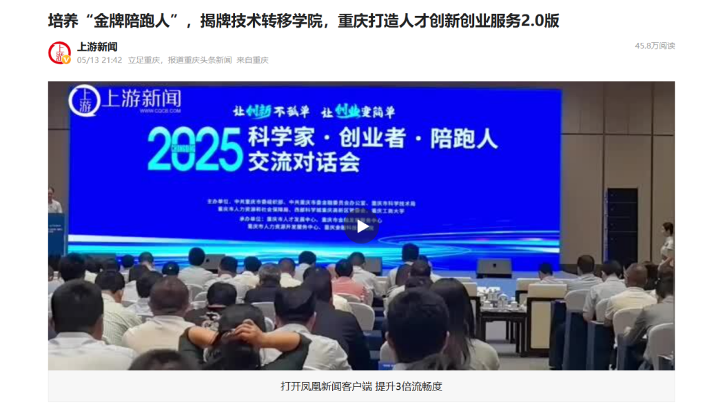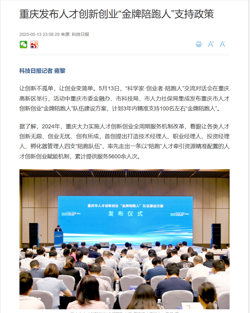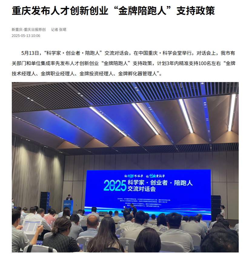 5月13日,“科学家·创业者·陪跑人”交流对话会在中国重庆·科学会堂举行,本次活动由市委组织部、市委金融办、市科技局、市人力社保局、西部科学城重庆高新区管委会和我校共同举办。我市有关部门和单位在会上集成发布重庆人才创新创业“金牌陪跑人”支持政策,在省级层面率先将服务人才创新创业实绩突出、取得重大标志性成果的陪跑人体系化纳入高层次人才认定范畴享受相应服务。