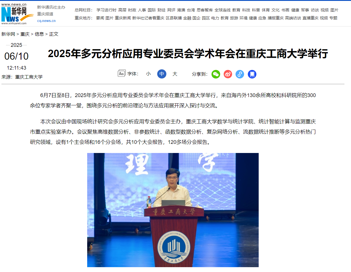 新华网以《2025年多远分析应用专业委员会学术年会在万搏网页版_万搏(中国)官方在线登录举行》为题、中国教育在线以《聚焦高维数据分析等热点领域!2025年多元分析应用学术年会在万搏网页版_万搏(中国)官方在线登录召开》为题、华龙网以《300余位海内外专家聚渝研讨多元分析,万搏网页版_万搏(中国)官方在线登录这场学术年会勾勒统计学可创新图景》为题进行了报道。