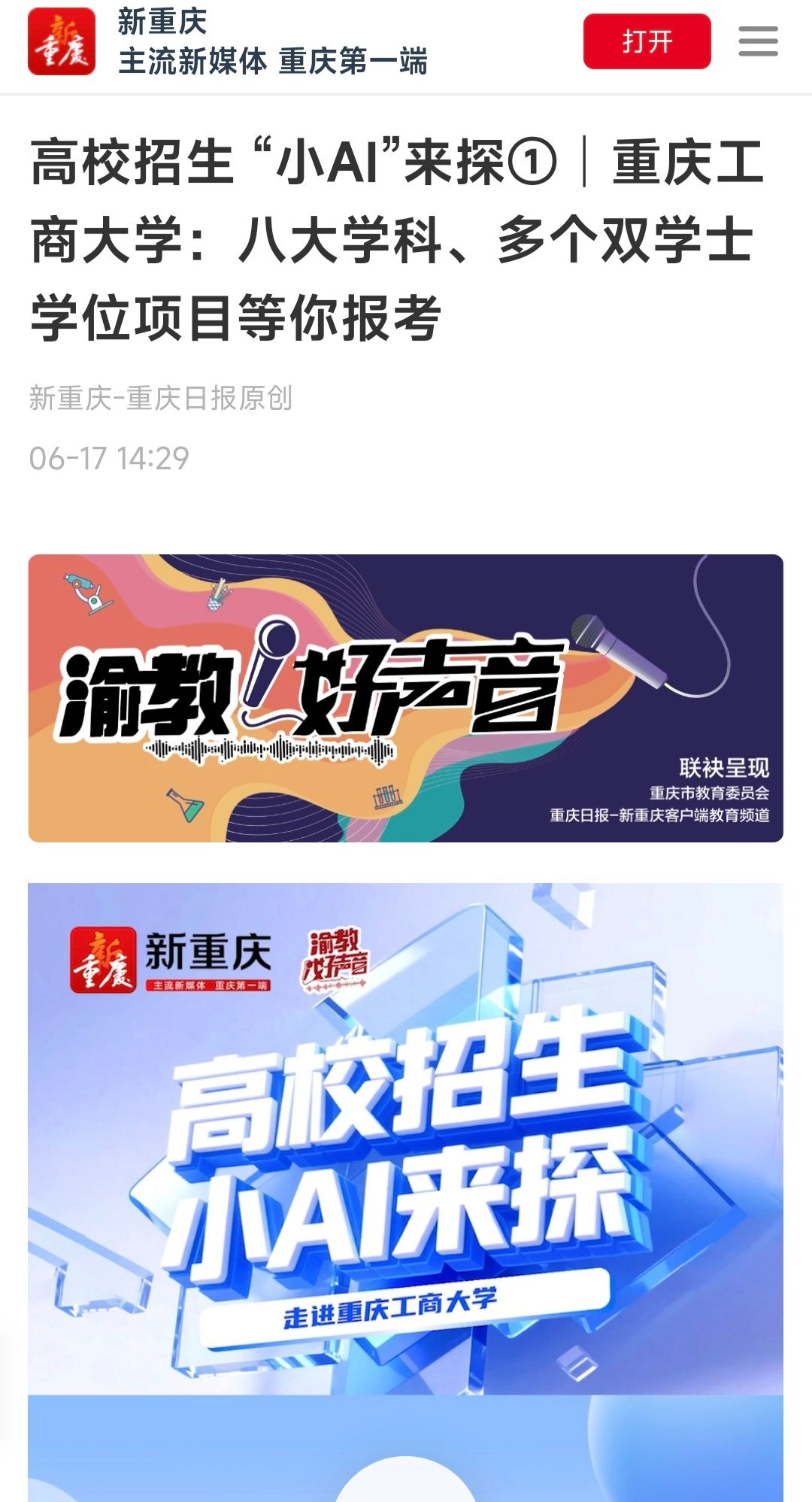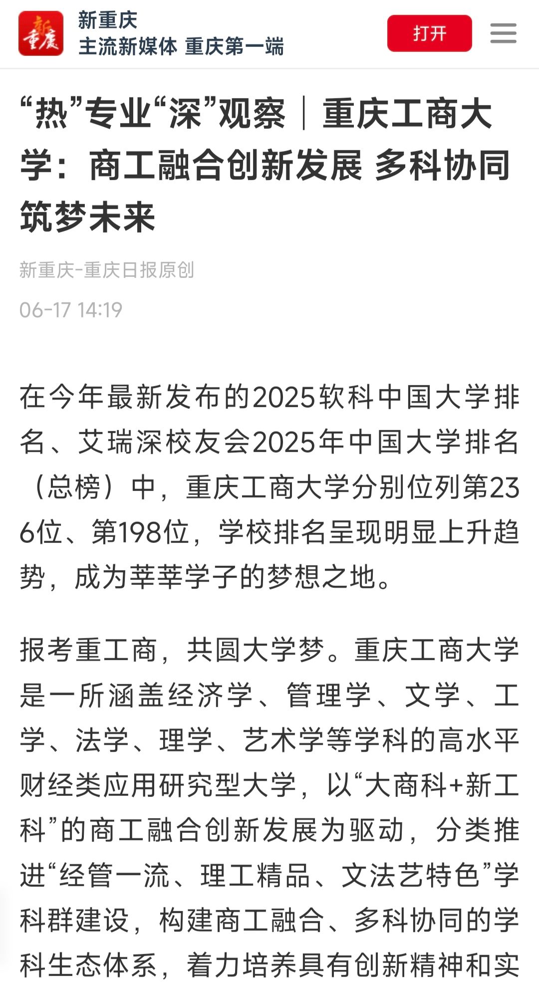 新重庆-重庆日报以《“热”专业“深”观察│万搏网页版_万搏(中国)官方在线登录:商工融合创新发展 多科协同筑梦未来》《高校招生“小AI”来探①│万搏网页版_万搏(中国)官方在线登录:八大学科、多个双学士学位项目等你报考》为题,报道了我校特色办学成果与招生亮点。