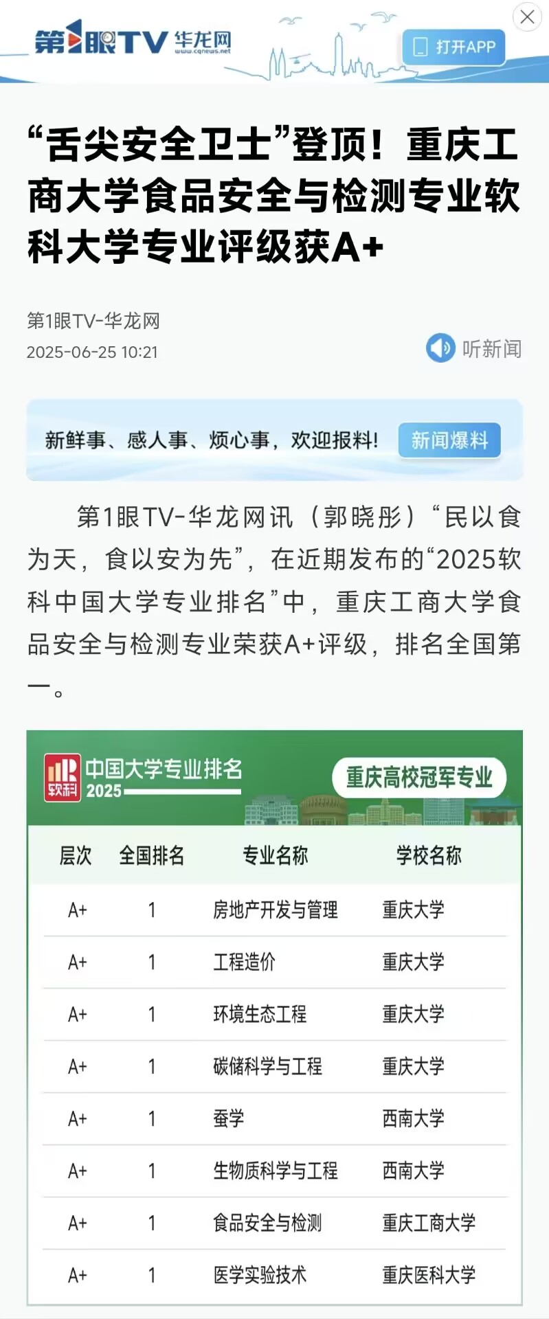 近日,“2025软科中国大学专业排名”中,我校食品安全与检测专业凭借其卓越的实力和突出的特色,荣获A+评级,专业排名全国第一。