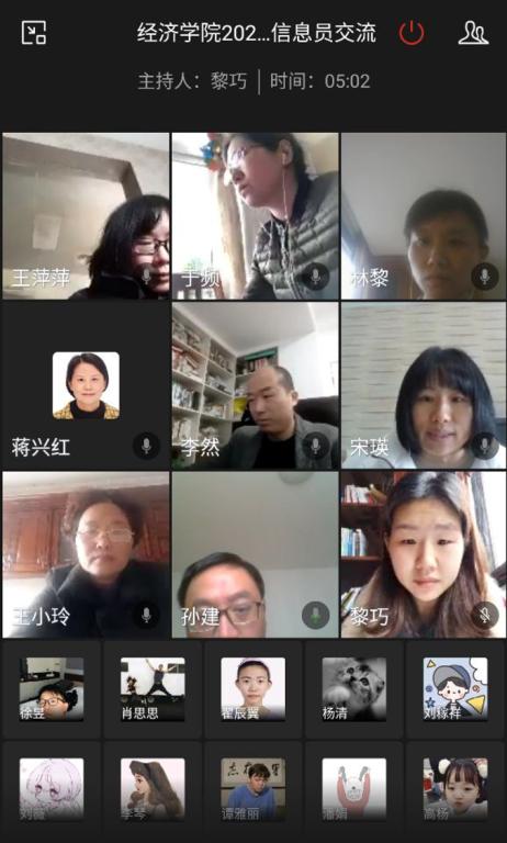 为更好推动在线教学,经济学院于2020年3月6日下午组织全体教学信息员在企业微信会议平台召开了春季学期期初教学检查暨学生信息员交流视频会。会议由经济学院分管教学副院长宋瑛主持,学院党委书记王小玲、副书记于频、院督导副组长孙建教授、各系系主任和教务办人员参加会议。