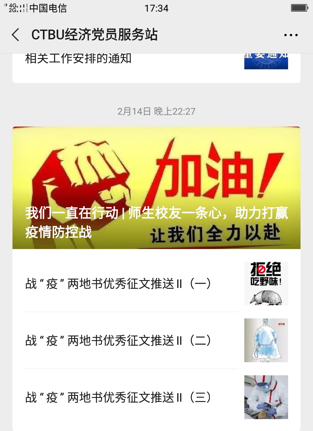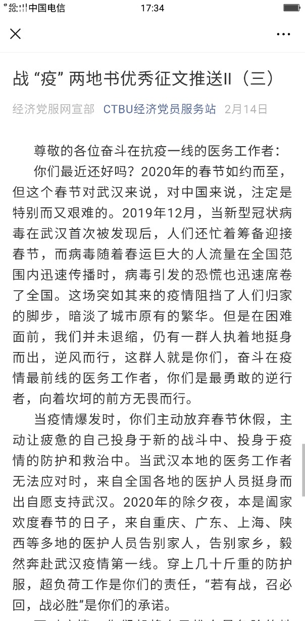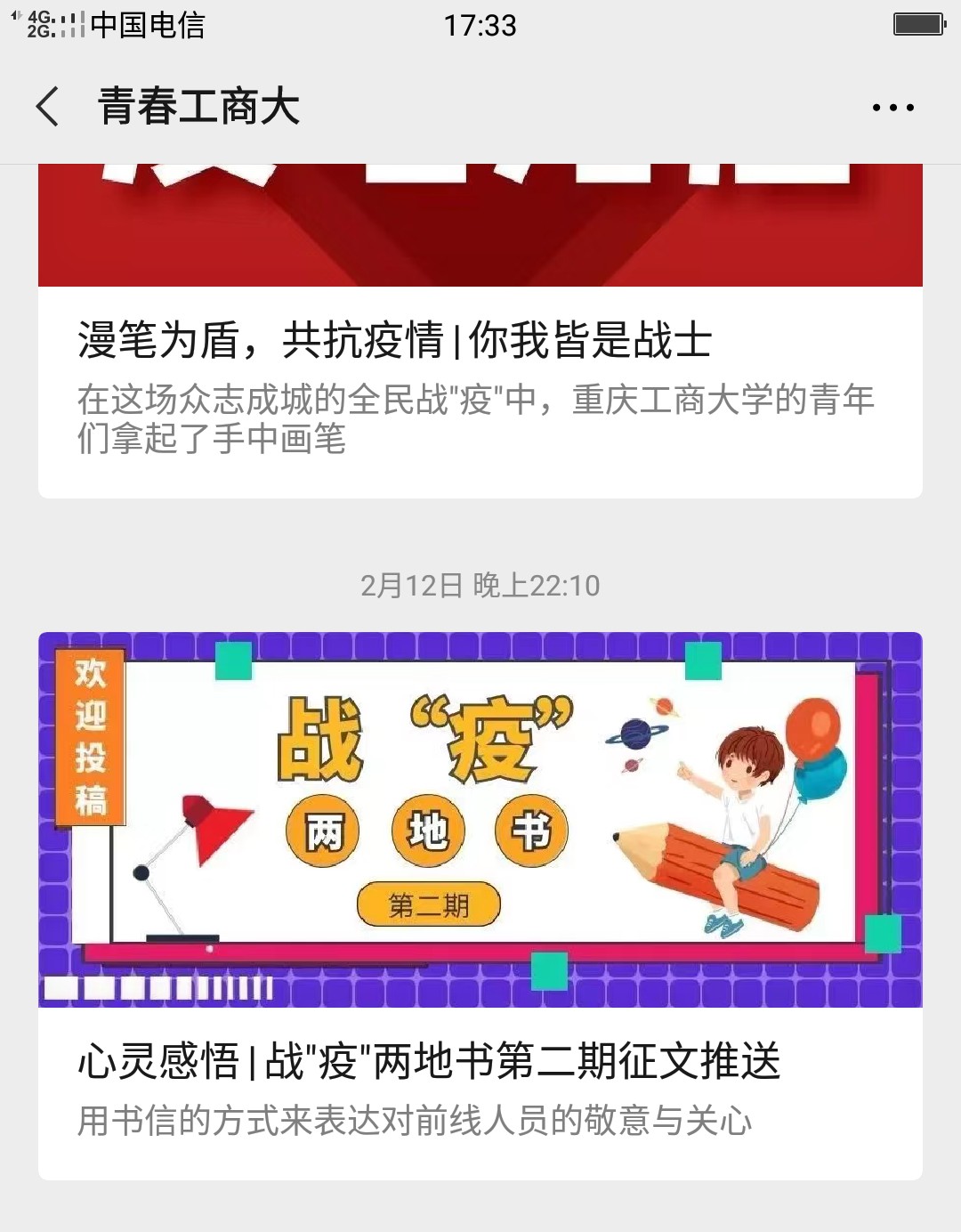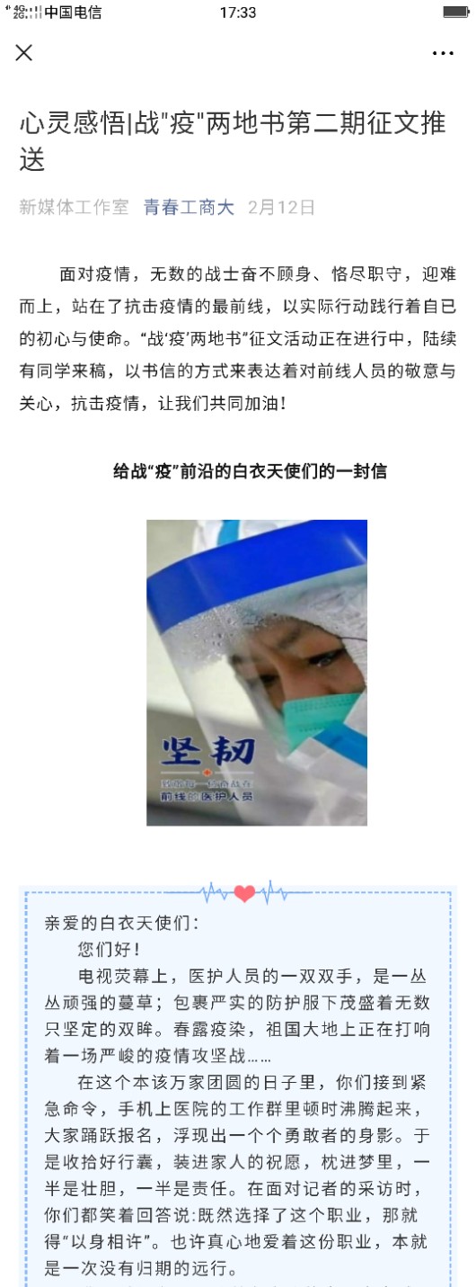 自新冠疫情发生以来,学校学工部、校团委、经济学院联合主办“战‘疫’两地书”活动,以“给......的一封信”的书信形式,征集原创、尚未公开发表征文,给奋斗在一线的广大医护人员、基层干部或湖北、武汉的同学们送去温暖与正能量。《给“白衣战士”的一封信》《给钟南山院士的一封信》《给武汉同胞们的一封信》《给新冠病毒的一封信》......这一封封的信件寄托着我校学生的敬佩、关心、希冀、牵挂,让艰难的日子充满温情,让战“疫”充满必胜的信心。