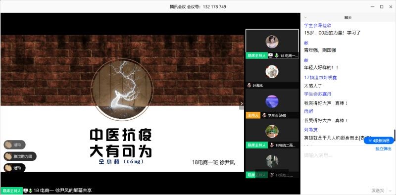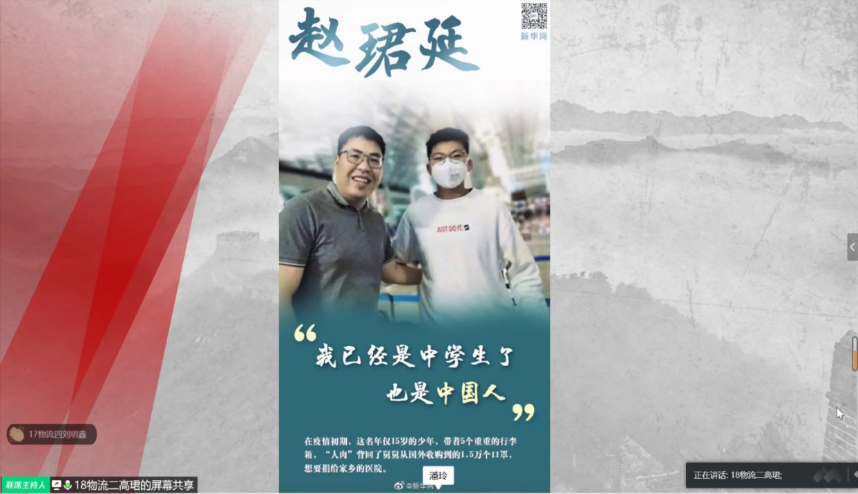 比赛正式开始后,由初赛胜出的十名选手依次进行屏幕共享和主题宣讲。18级国营二班的颜琴,以点点萤火,人间星火为题,通过汶川抗疫巾帼英雄佘沙容,向大家生动地诠释了什么是英雄,借此致敬那些平凡而伟大的医护人员;18级国营二班的邓子俊向大家展示了最质朴的善良,为白衣天使加一点油,送出一份心意的东巷环卫;18级国商二班的张平是以给一封给爸爸的信的形式,讲述了要想回家陪伴父母又秉承爱国心仍然坚持在抗疫一线的护士黄雪梅的故事;18级物流二班的高珺给大家介绍了千里走单骑,“人肉”带回从国外收购的口罩并捐给家乡的中学生赵珺延;18级电商一班的徐尹凤带来了在抗击新冠肺炎中让中医同样有用武之地的仝小林的故事。