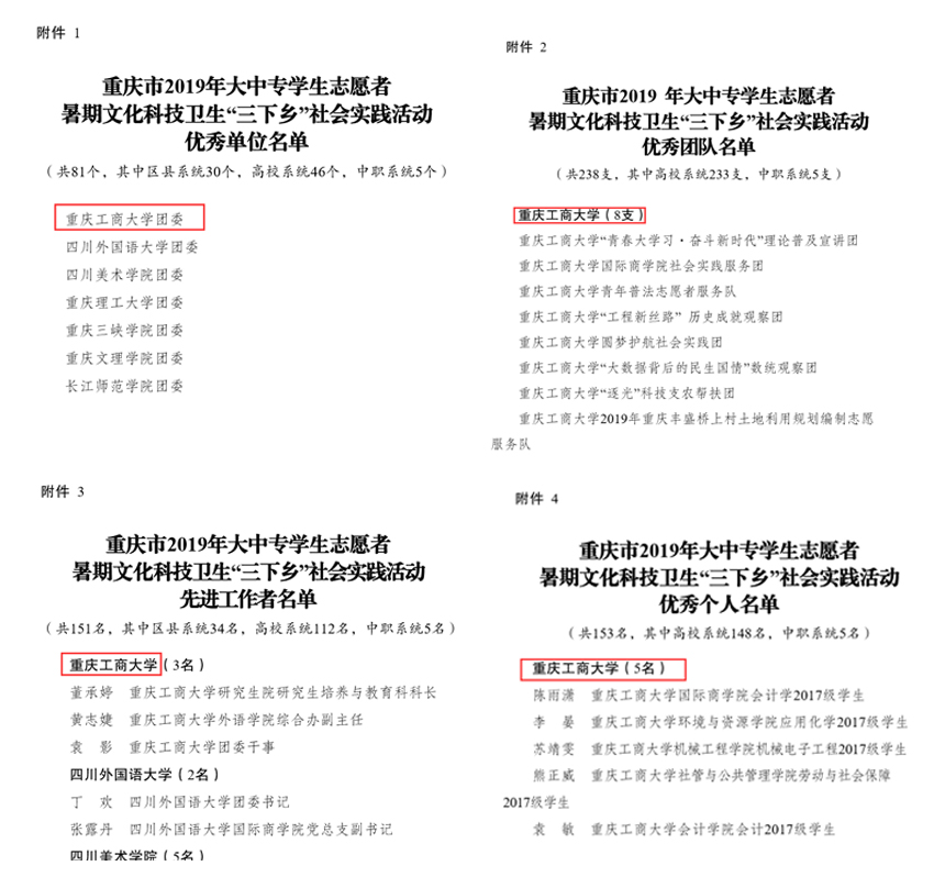 同时 ,我校获评重庆市“三下乡”社会实践活动优秀单位;圆梦护航社会实践团(经济学院)、“青春大学习•奋斗新时代”理论普及宣讲团(财经金融学院)、青年普法志愿者服务队(法学院)、“工程新丝路”历史成就观察团(管理学院)、“大数据背后的民生国情”数统观察团(数学与统计学院)、“逐光”科技支农帮扶团(文学与新闻学院)、重庆丰盛桥上村土地利用规划编制志愿服务队(旅游与国土资源学院)、万搏网页版_万搏(中国)官方在线登录社会实践服务团(国际商学院)等8支团队获评市级优秀团队;董承婷(研究生院)、黄志婕(外语学院)、袁影(团委)3位老师获评市级先进工作者;陈雨潇(国际商学院)、李晏(环境与资源学院)、苏靖雯(机械工程学院)、熊正威(社管与公共管理学院)、袁敏(会计学院)5位同学获评市级先进个人。
